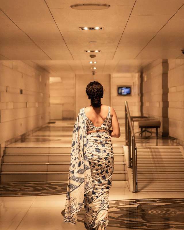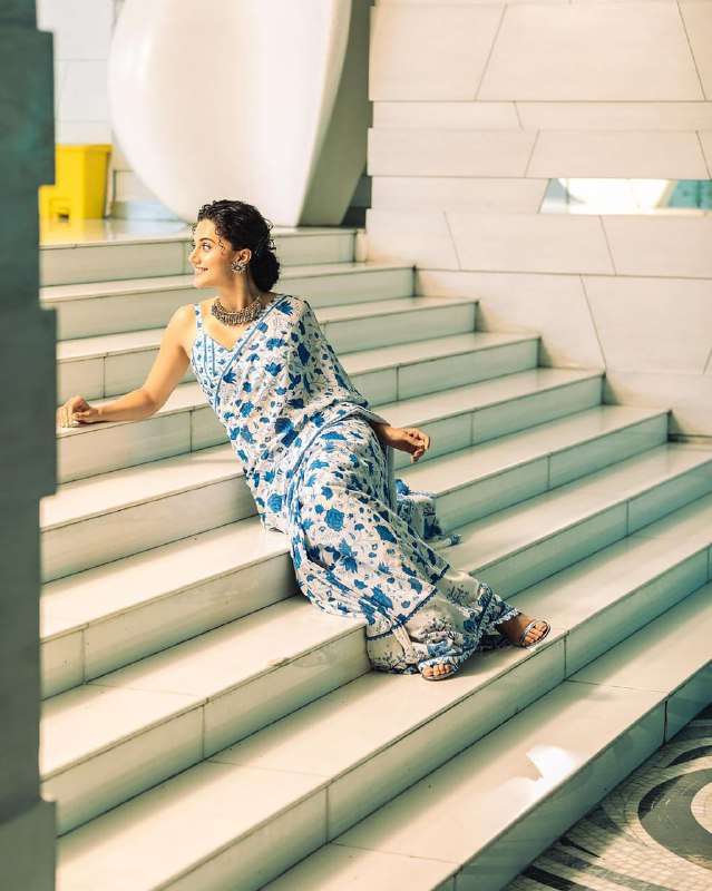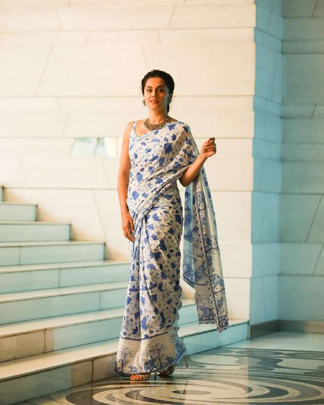 104-Taapsee FABRICS : Soft Pure Cotton SAREES : 5.50 MTR PURE COTTON JAIPUR BLOCK PRINT SAREES BLOUSE : 0.80 MTR PURE COTTON PRINTED Colour - WHITE AND BLUE