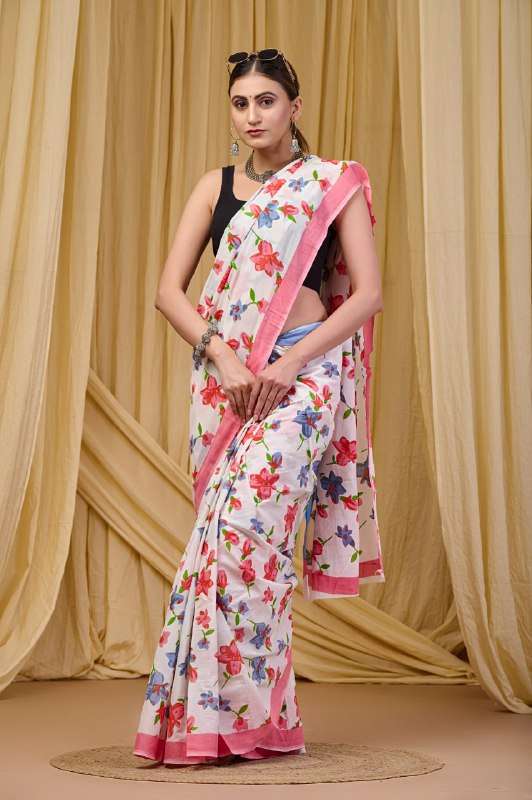 Title | 108 LOTUS DIWALI PARTY SAREE BAGRU FLOWER PRINT SAREE WITH SOLID BLOUSE SET |