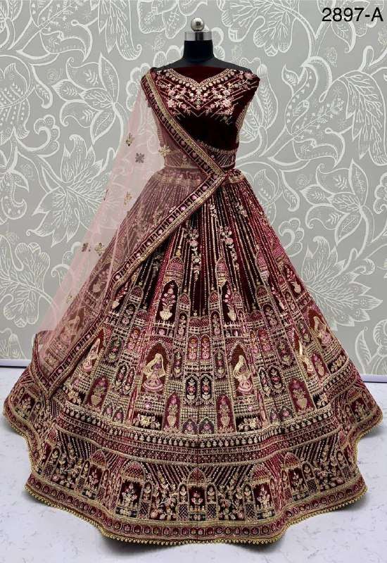 2897 GUJARATI WEDDING MAROON VELVET HEAVY WORK DOUBLE DUPATTA BRIDAL LEHENGA CHOLI BUY SURAT STORE