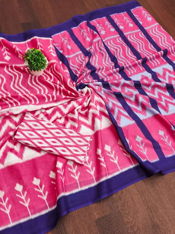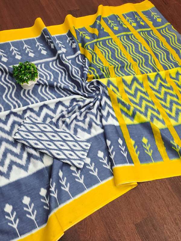40-KALINI_BOTTLE GREEN 40-KALINI_GREY 40-KALINI_ORANGE 40-KALINI_PINK FABRICS : MULMUL COTTON SAREES : 5.50 MTR APPROX PURE MULMUL COTTON IKKAT PRINTD SAREES BLOUSE : 0.80 MTR APPROX RUNING PURE COTTON SEM AS PHOTO BLOUSE PICE