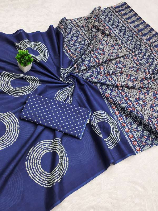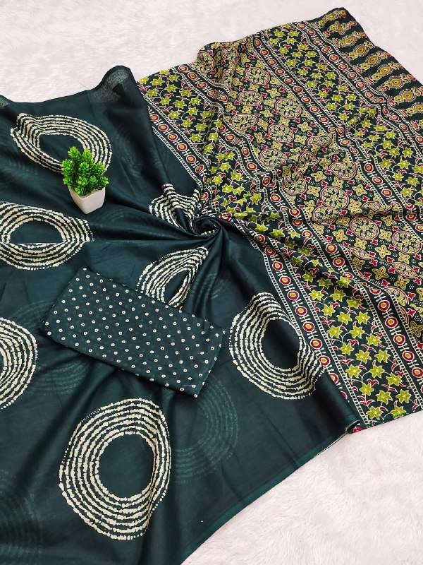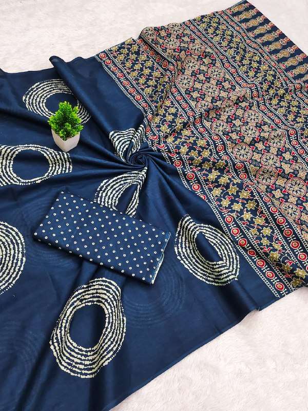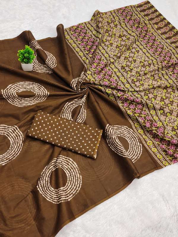 83-BANDHANI STYL-UP_BROWN / DARK BLUE / GREEN / PINK / RED / ROYAL BLUE 🧵 Fabric: Pure Mul Cotton 🎨 Print: Traditional Ajrakh Bandhej Handblock Print sarees 🌸 Comfort: Ultra-soft & lightweight 📏 Saree Cut: 6.3 meters (Including Blouse) 👚 Blouse: Attached Running Blouse