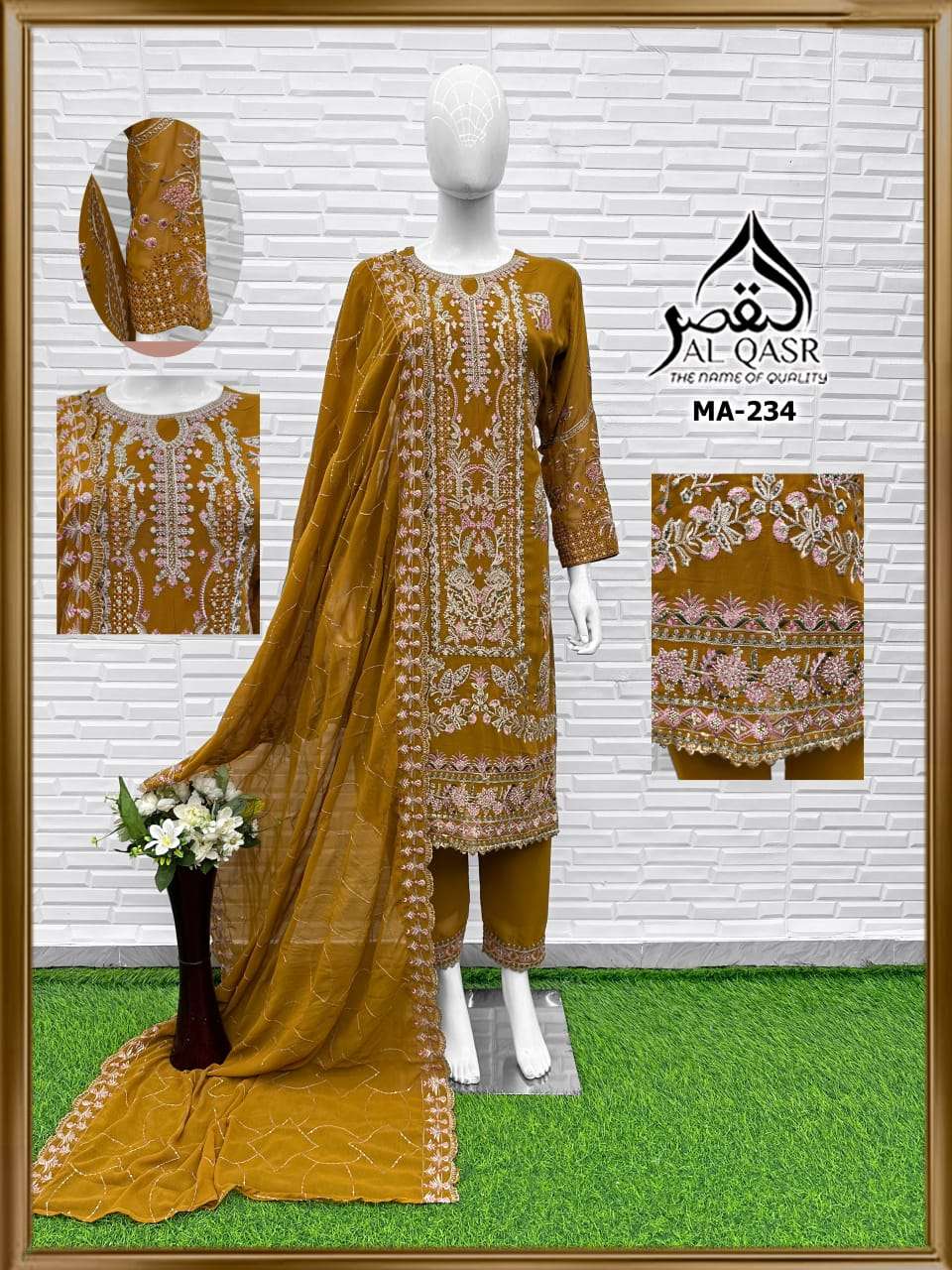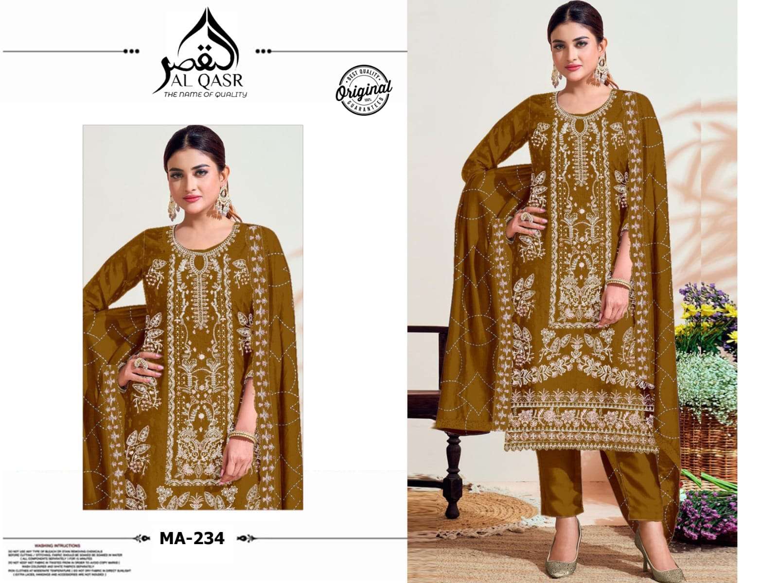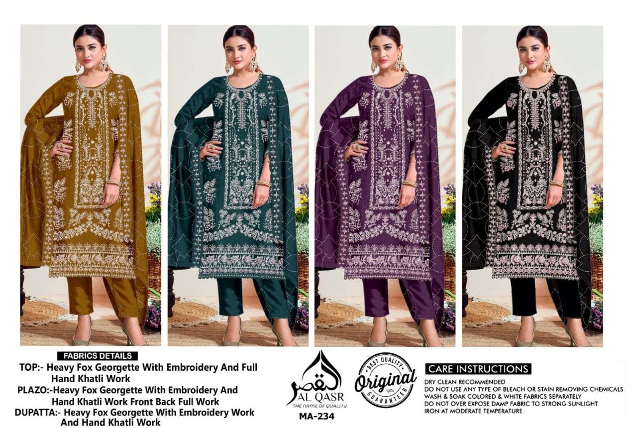 Buy Online AL QASR 234 HAND KHATLI WORK ZARKA PAKISTANI SUIT AT SHADI FUNCTION CLOTH 4 Pcs of Full Catalogue at Wholesale Price. Looking for AL QASR 234 HAND KHATLI WORK ZARKA PAKISTANI SUIT AT SHADI FUNCTION CLOTH Full Catalouge at Best Price? Buy Now AL QASR 234 HAND KHATLI WORK ZARKA PAKISTANI SUIT AT SHADI FUNCTION CLOTH at Wholesale Rate of Rs 5996 with Total 4 Pcs from authroized dealer and supplier of Al Qasr Brand. Cost of Each piece is just only Rs 1499 which is very low and affordable price to resale the product in your retail store Ethnic Export is Surat based Wholesale Supplier & Dealer of Al Qasr Brand. Click on Brand name to Know more about Al Qasr Brand's products.Call or Whatsapp on +91-9825759366 for booking or enquiry