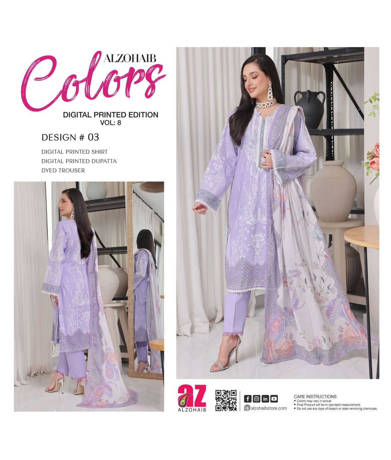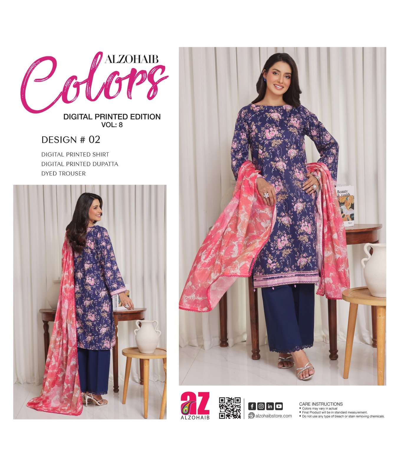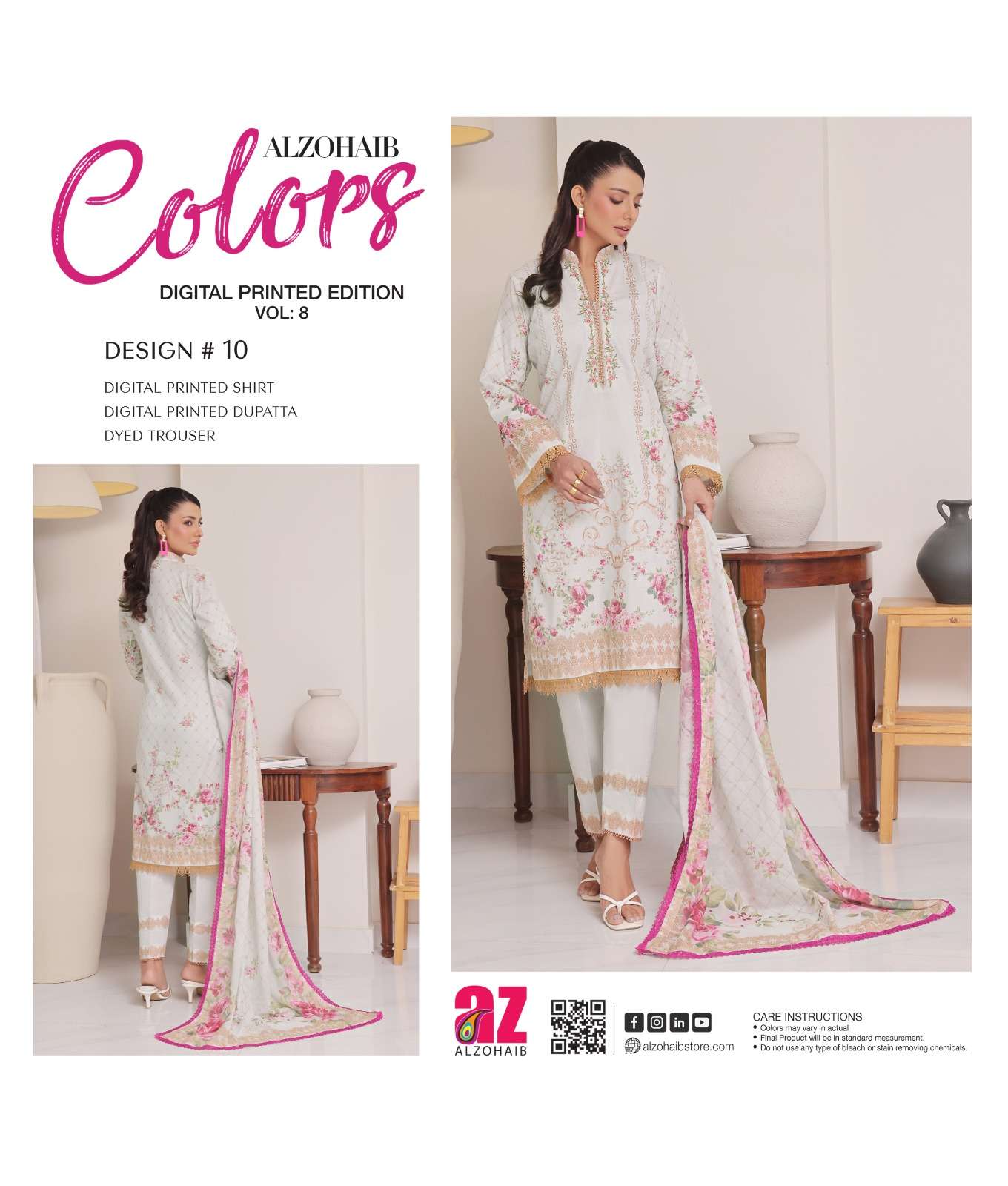 AL ZOHAIB COLORS DIGITAL PRINTED LAWN COLLECTION VOL-8 DIGITAL PRINTED LAWN SHIRT WITH DIGITAL PRINTED LAWN DUPATTA WITH DYED TROUSERS 10 DESIGNER SUIT FULL SET ONLY |