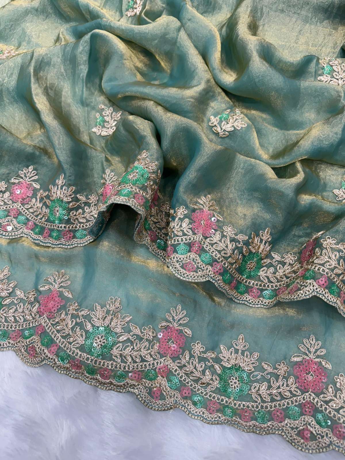 | Other Details | Saree:- Pure Fandy Sattin Silk With Beautiful Multicolour Sequence and cording embroidery work with Cut work border Blouse:- Paired With Fandy Sattin Heavily Worked Fancy Blouse design 1 single also av |