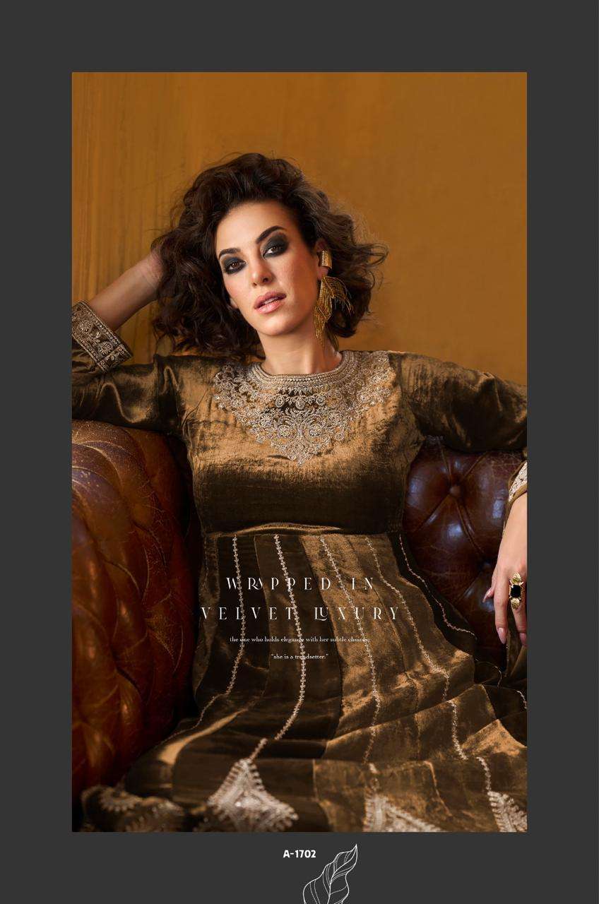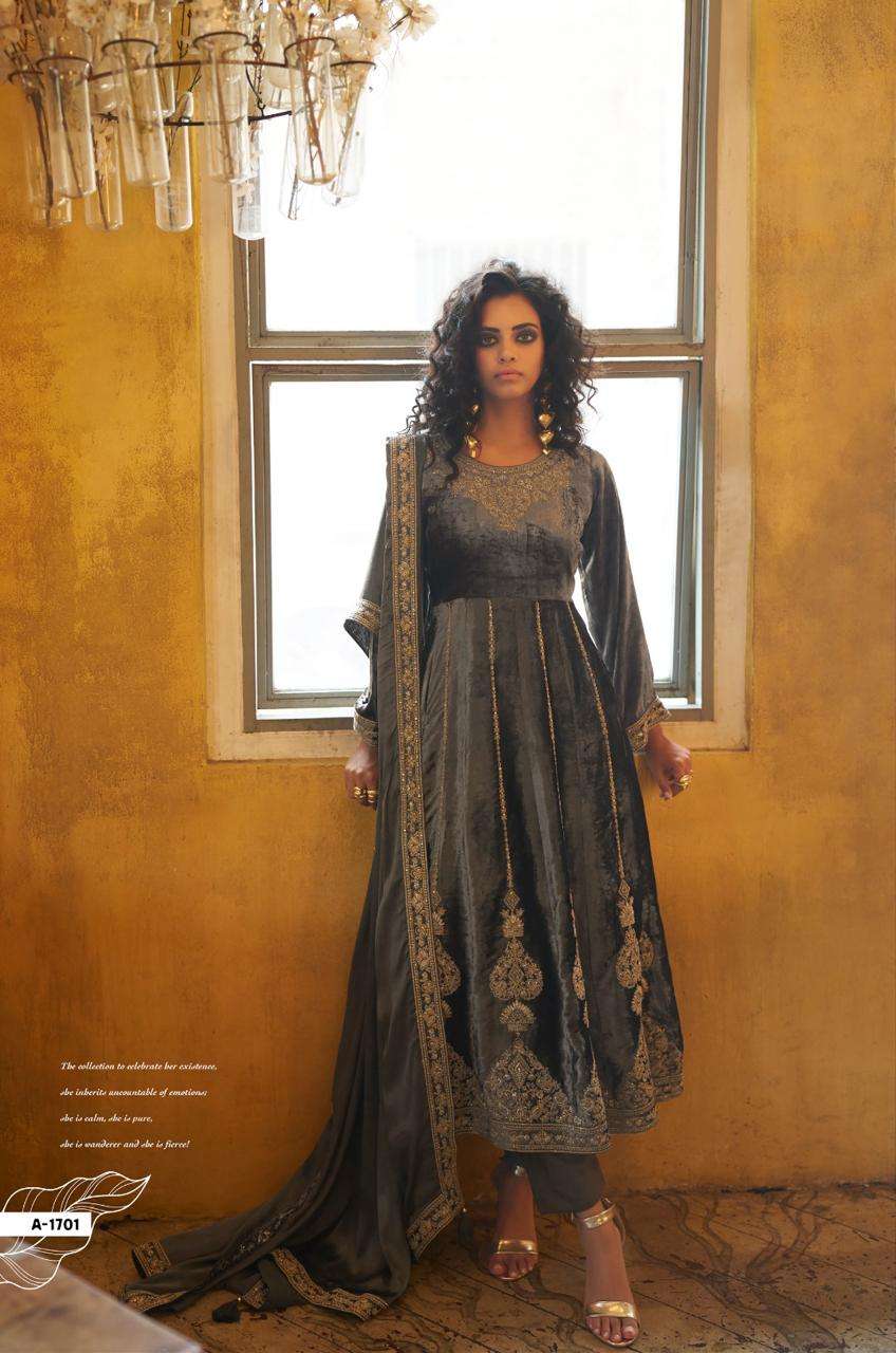 ALQA GREY & GOLD VISCOSE VELVET FANCY WORK ANARKALI STYLE SUIT TO WEDDING OUTFIT ETHNIC