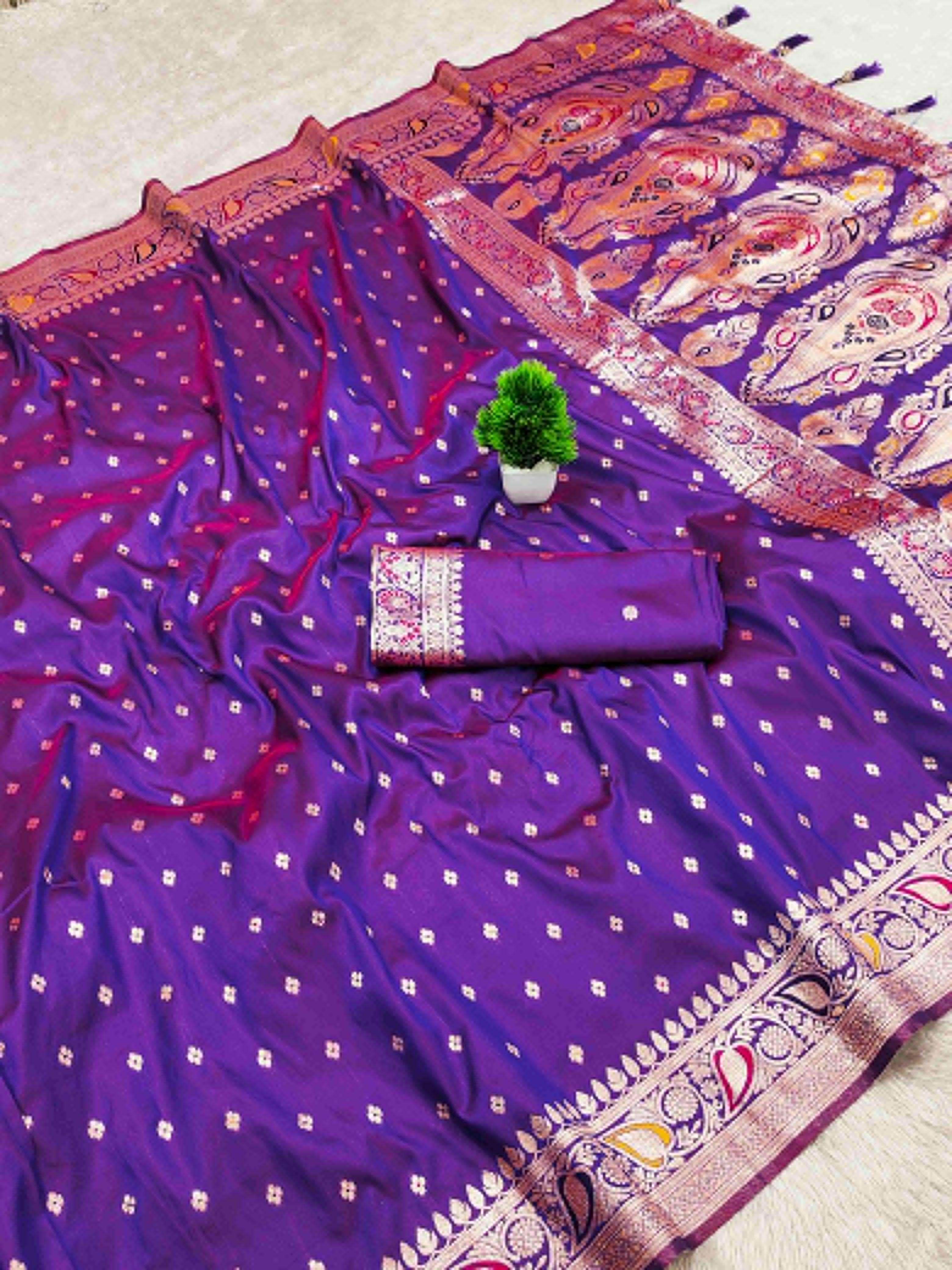 Catlouge : Banarasi -Leaf Saree :- Soft Banarasi silk saree with zari weaving small motifs design all over the saree & Zari weawing Rich pallu with Meenakari weawing border & Tassels attached at Pallu End. Blouse :- Soft silk weawing blouse piece with sleeve border SINGLE ALOS AVA |