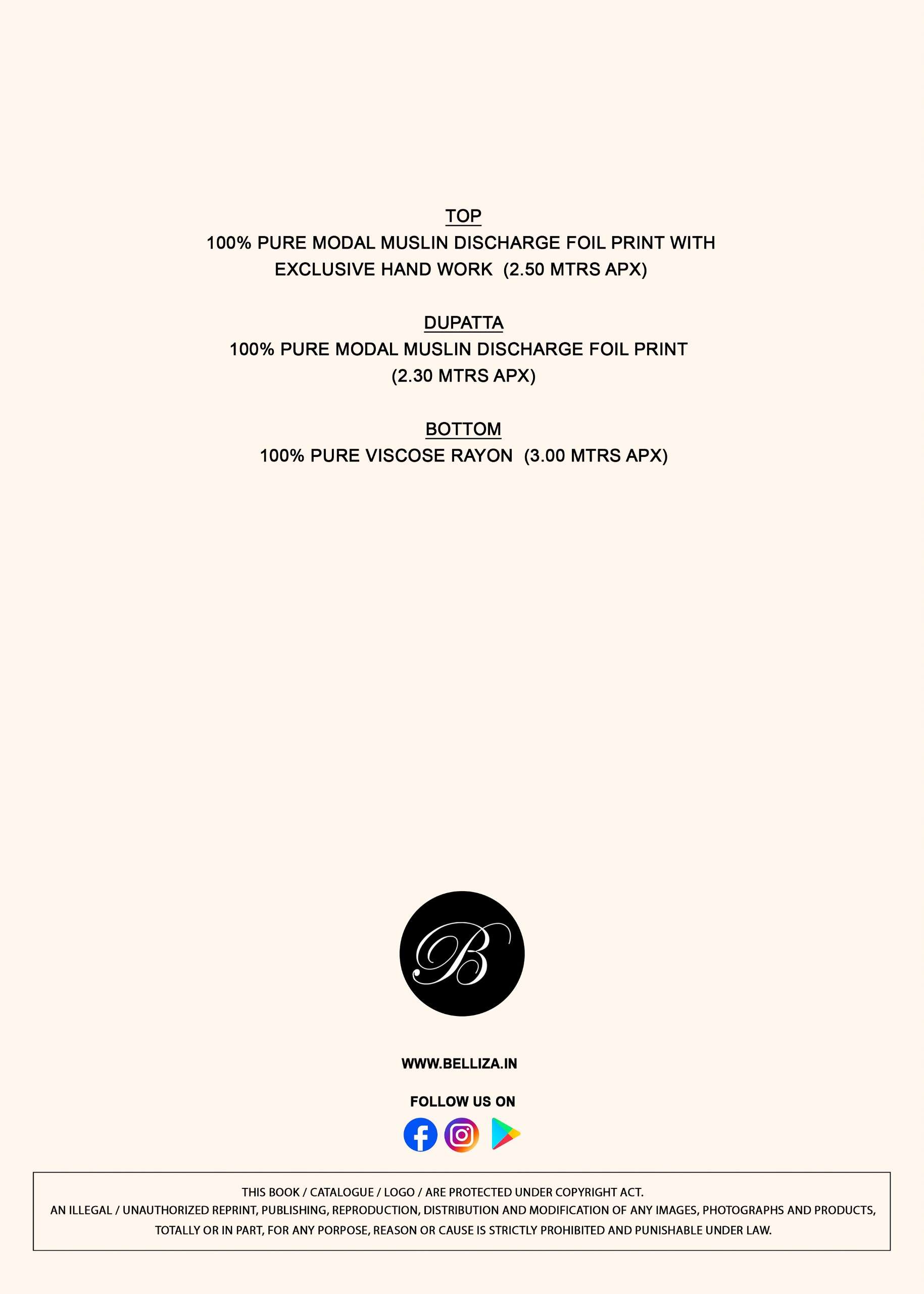 Buy Online BELLIZA DESIGNER STUDIO BETAAB MODAL VISCOSE DISCHARGE FOIL EXCLUSIVE 3 PIECE SUIT SUPPLIER 6 Pcs of Full Catalogue at Wholesale Price. Looking for BELLIZA DESIGNER STUDIO BETAAB MODAL VISCOSE DISCHARGE FOIL EXCLUSIVE 3 PIECE SUIT SUPPLIER Full Catalouge at Best Price? Buy Now BELLIZA DESIGNER STUDIO BETAAB MODAL VISCOSE DISCHARGE FOIL EXCLUSIVE 3 PIECE SUIT SUPPLIER at Wholesale Rate of Rs 4770 with Total 6 Pcs from authroized dealer and supplier of Belliza Designer Studio Brand. Cost of Each piece is just only Rs 795 which is very low and affordable price to resale the product in your retail store Ethnic Export is Surat based Wholesale Supplier & Dealer of Belliza Designer Studio Brand. Click on Brand name to Know more about Belliza Designer Studio Brand's products.Call or Whatsapp on +91-9825759366 for booking or enquiry