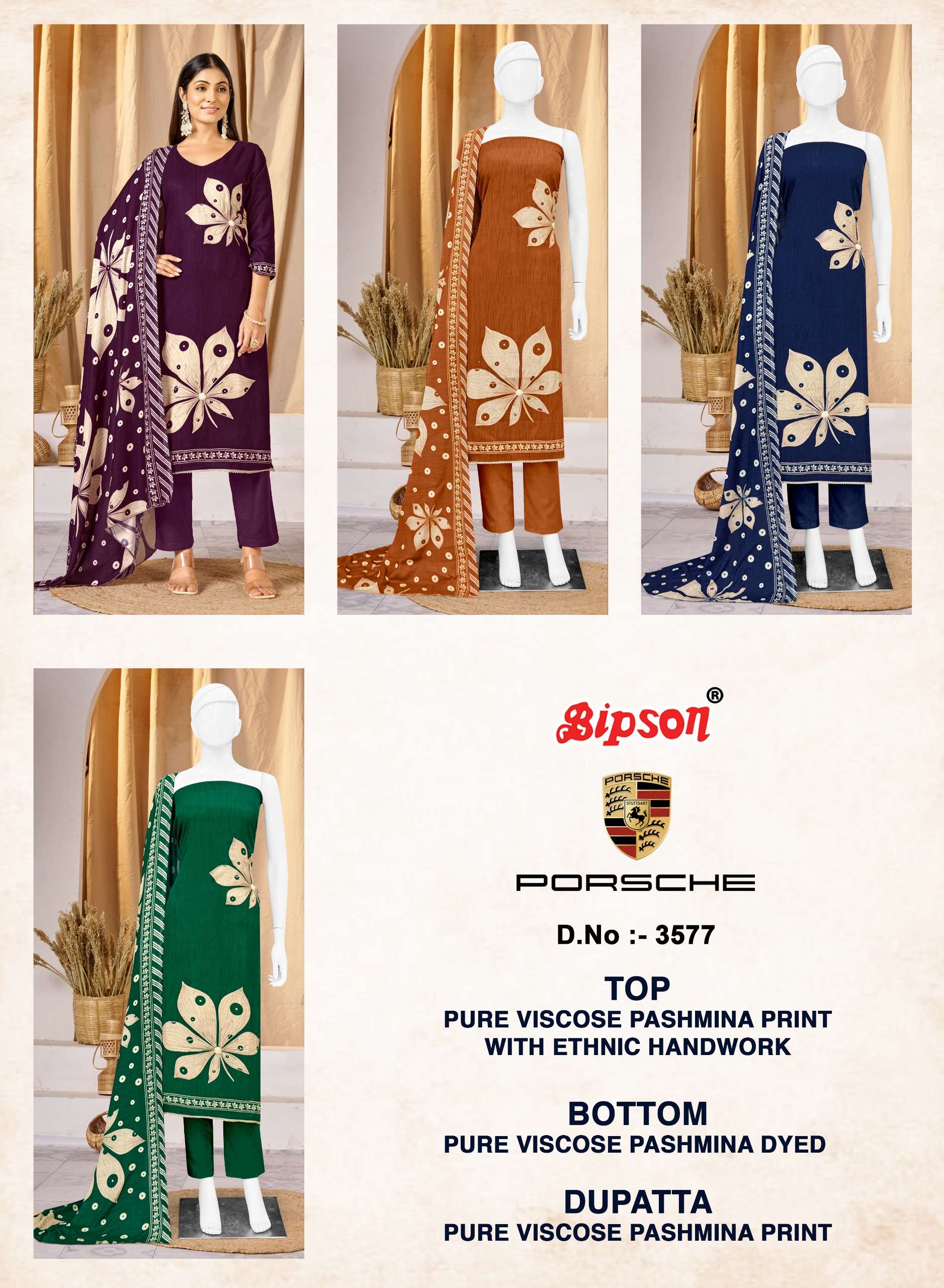 Buy Online BIPSON PRINTS PORSCHE 3577 VISCOSE FABRIC PASHMINA DESIGN SALWAR SUIT FESTIVAL WEAR 4 Pcs of Full Catalogue at Wholesale Price. Looking for BIPSON PRINTS PORSCHE 3577 VISCOSE FABRIC PASHMINA DESIGN SALWAR SUIT FESTIVAL WEAR Full Catalouge at Best Price? Buy Now BIPSON PRINTS PORSCHE 3577 VISCOSE FABRIC PASHMINA DESIGN SALWAR SUIT FESTIVAL WEAR at Wholesale Rate of Rs 3500 with Total 4 Pcs from authroized dealer and supplier of BIPSON FASHION Brand. Cost of Each piece is just only Rs 875 which is very low and affordable price to resale the product in your retail store Ethnic Export is Surat based Wholesale Supplier & Dealer of BIPSON FASHION Brand. Click on Brand name to Know more about BIPSON FASHION Brand's products.Call or Whatsapp on +91-9825759366 for booking or enquiry