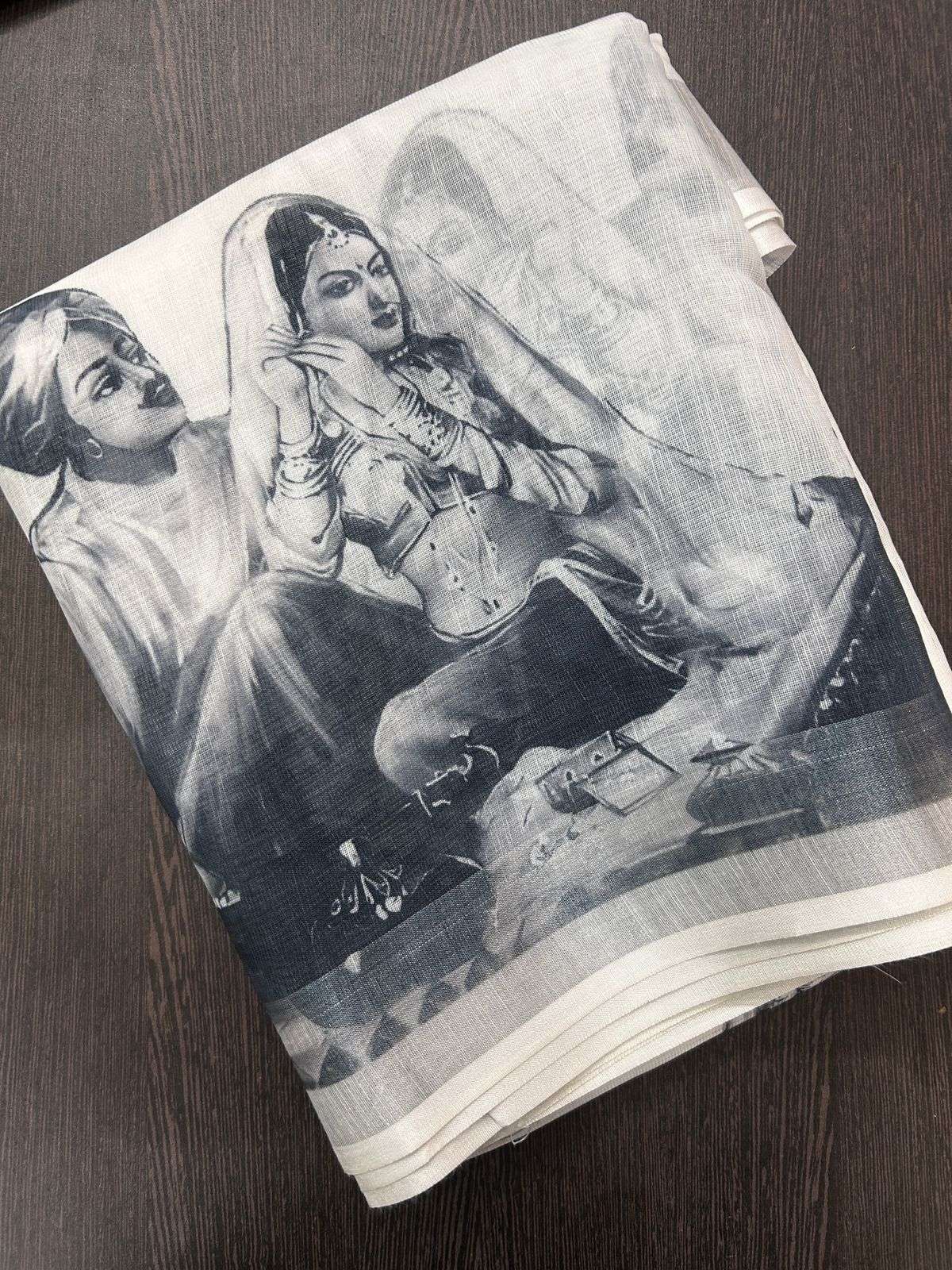 black & white digital printed Linen Fabric Fancy Saree Best Collection DHa 243