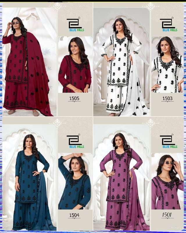 Buy Online BLUE HILLS BLACK BEAUTY JAIPUR PRINT EMBROIDERY WORK PALAZZO 3PIECE SUIT MARKET 4 Pcs of Full Catalogue at Wholesale Price. Looking for BLUE HILLS BLACK BEAUTY JAIPUR PRINT EMBROIDERY WORK PALAZZO 3PIECE SUIT MARKET Full Catalouge at Best Price? Buy Now BLUE HILLS BLACK BEAUTY JAIPUR PRINT EMBROIDERY WORK PALAZZO 3PIECE SUIT MARKET at Wholesale Rate of Rs 3996 with Total 4 Pcs from authroized dealer and supplier of Blue Hills Brand. Cost of Each piece is just only Rs 999 which is very low and affordable price to resale the product in your retail store Ethnic Export is Surat based Wholesale Supplier & Dealer of Blue Hills Brand. Click on Brand name to Know more about Blue Hills Brand's products.Call or Whatsapp on +91-9825759366 for booking or enquiry