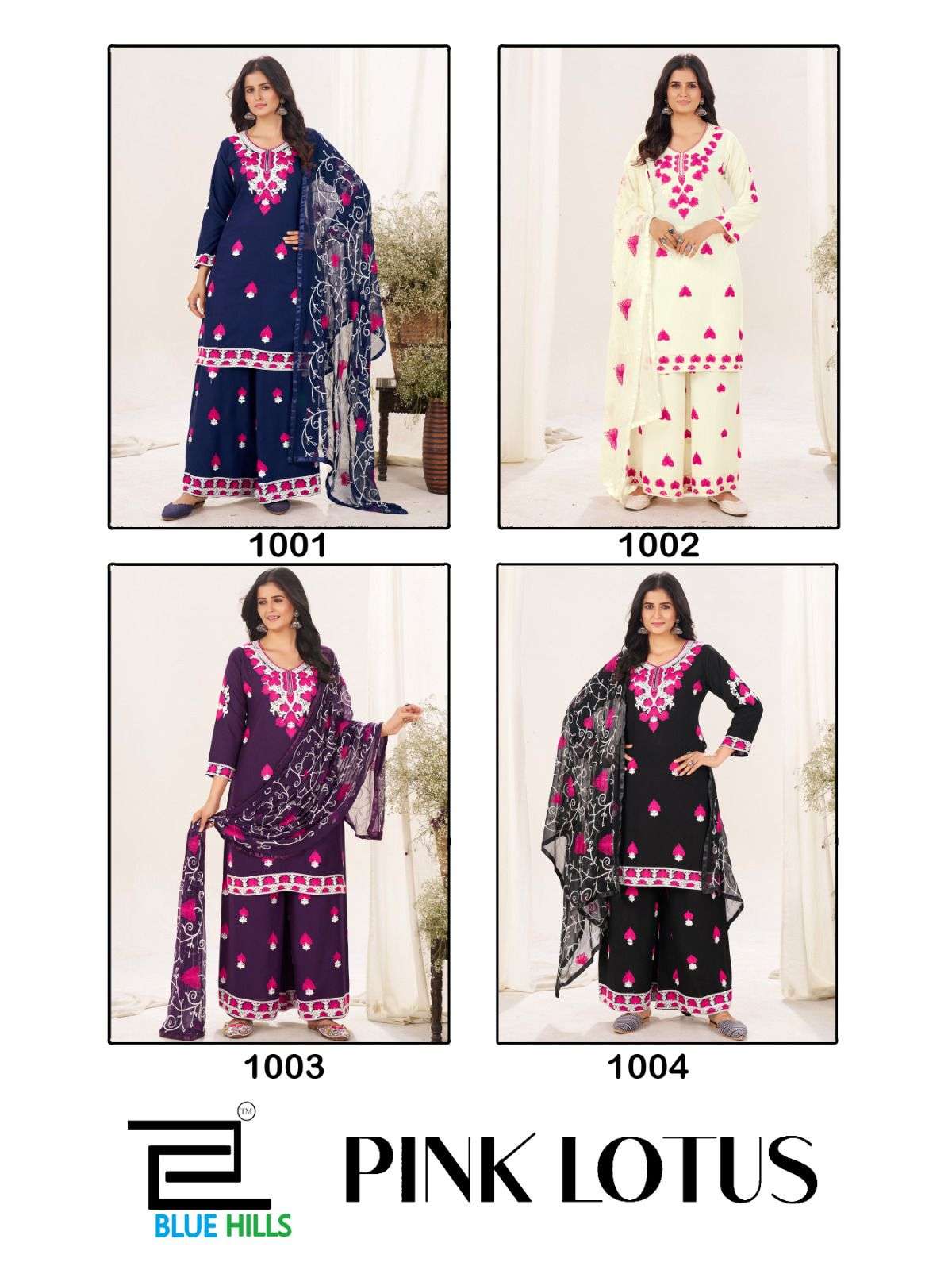 BLUE HILLS PINK LOTUS 14KG RAYON JAIPUR DESIGN PALAZZO 3 PIECE SUIT DEALER RATE