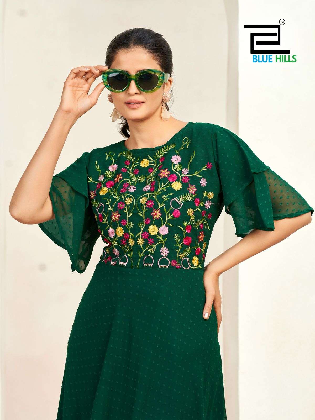 BLUE HILLS SENSATIONS GEORGETTE FABRIC SLEEVES PATTERN GOWN KURTI CATALOG IN SURAT SHOP