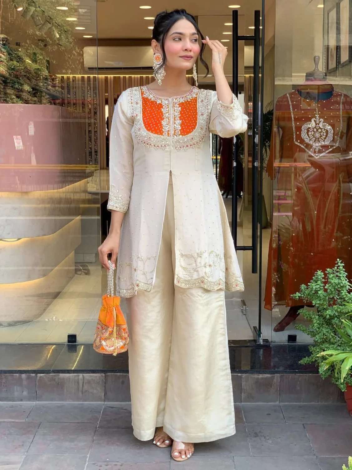 Roman Silk is a luxurious and high-quality fabric renowned for its exceptional smoothness, softness, and natural sheen. It offers a substantial yet flowing drape, making it ideal for structured ethnic silhouettes. The embroidery is typically concentrated on the neckline, cuffs, and sleeves, and a rich border on the hemline to enhance the garment's fall. The overall look is one of opulence and grace. The smooth silk fabric acts as a perfect canvas, allowing the detailed, textural embroidery to stand out and catch the light. With four colours. Size :- M(38) SINGLE ALSO AVA |