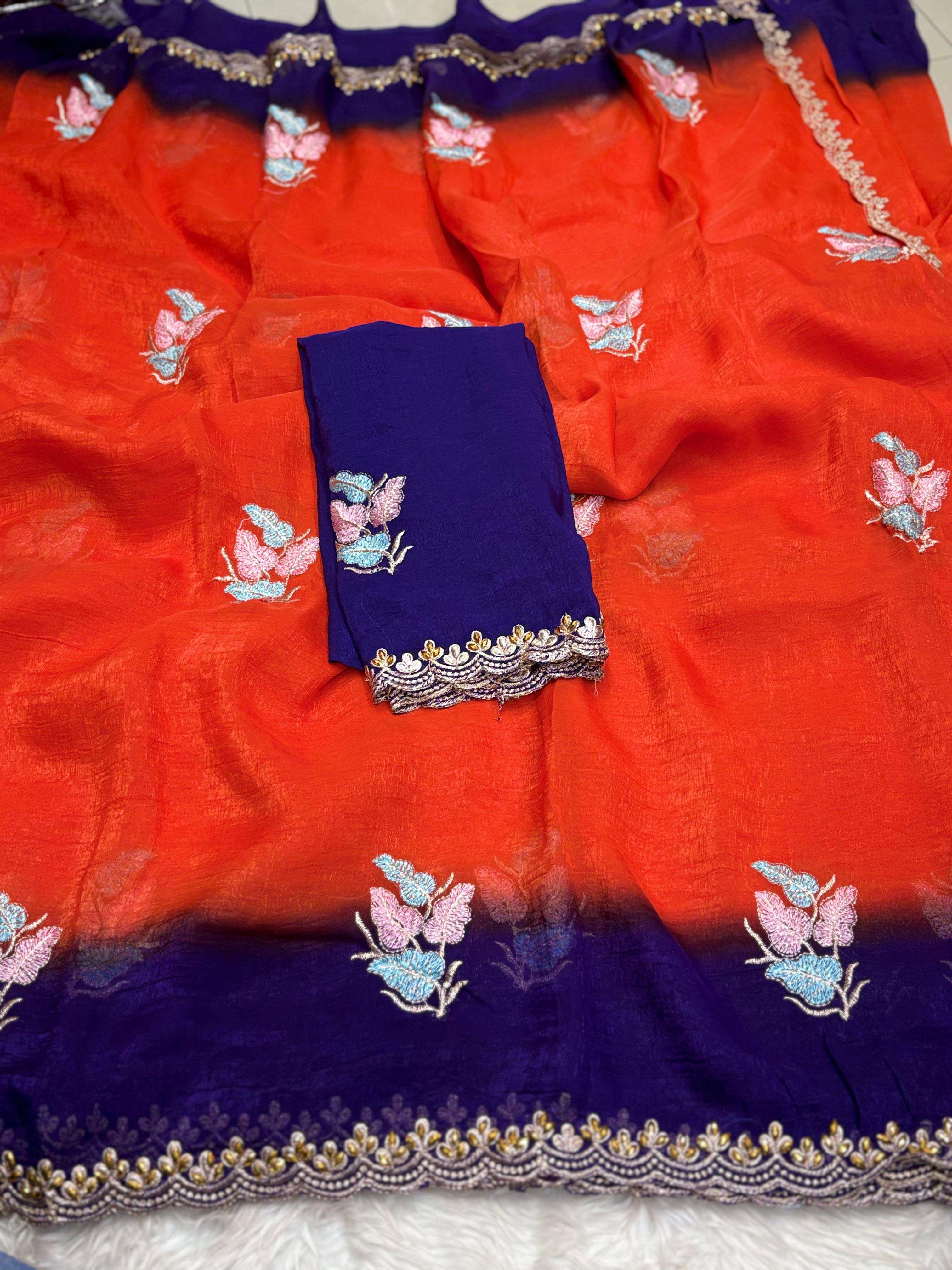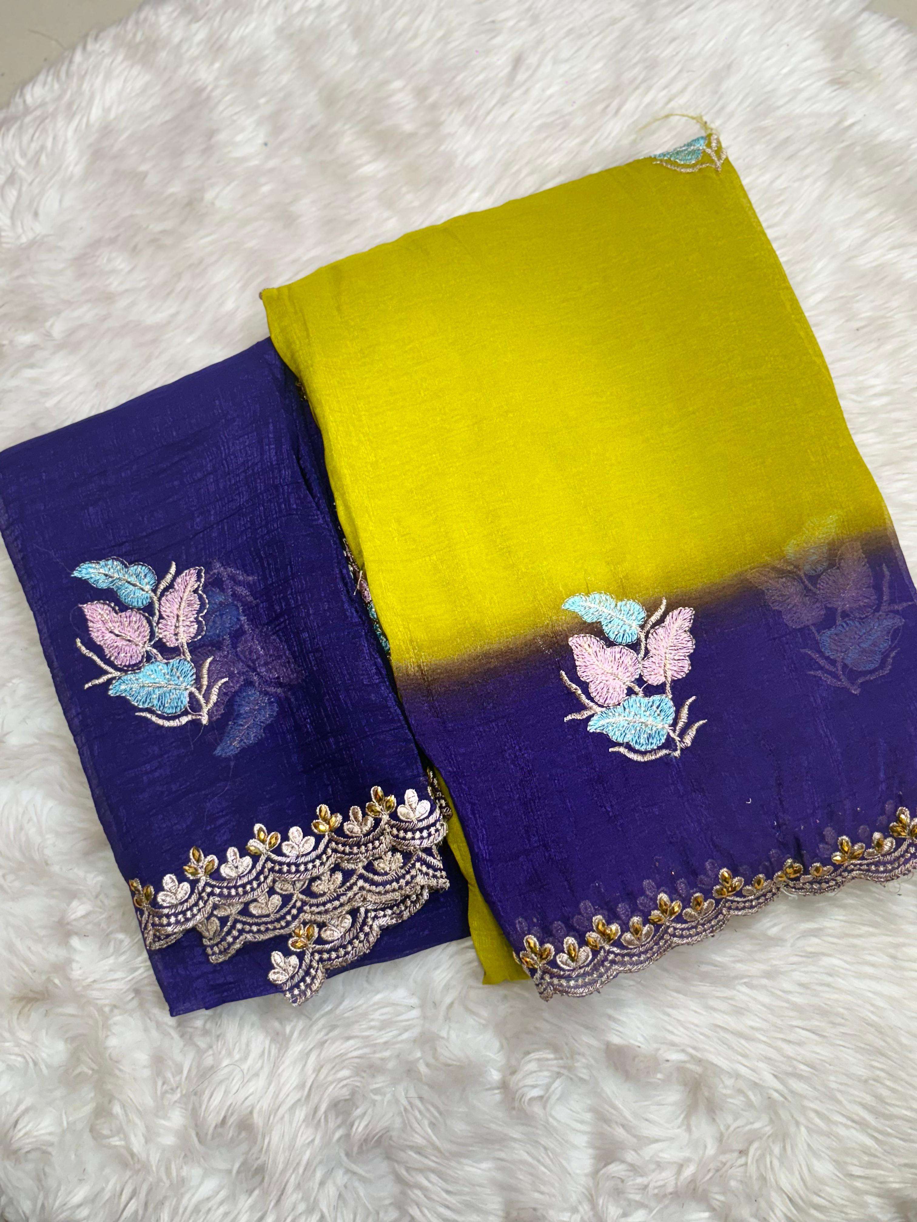 Quality- crunchy CHIFFON saree with elegant scalap embroidery work. Blouse- Rangoli embroidery blouse work . Saree- 5.50 mts. DESIGN 5 SINGLE ALSO AV |