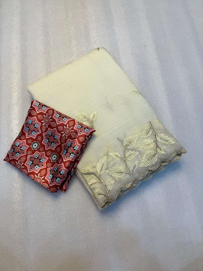 | Title | Crunchy Soft Silk All Over EMbroidery Work Off White Saree With Ajrakh Printed blouse Best collection |