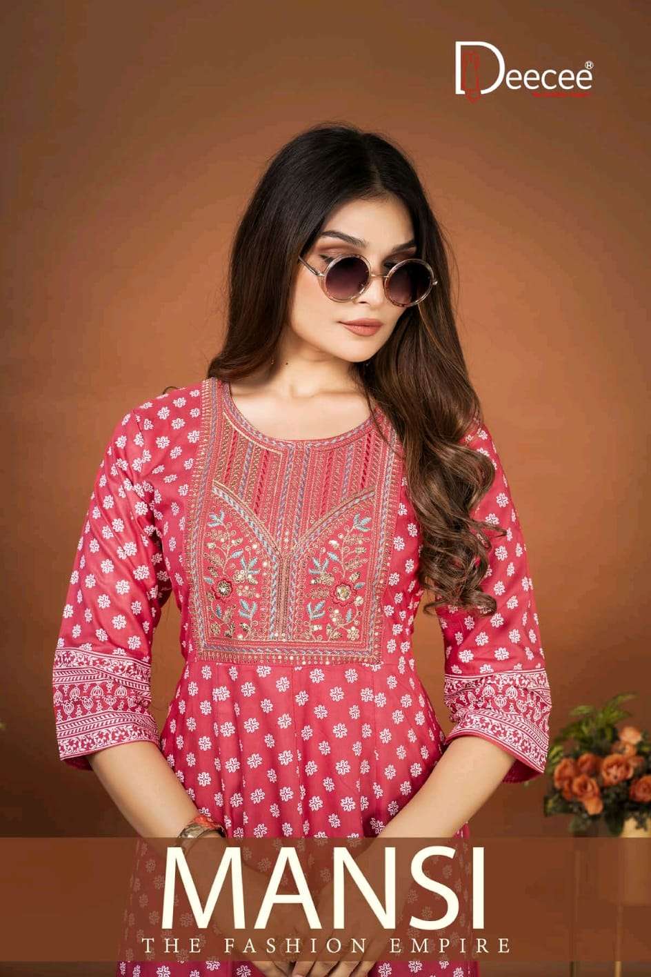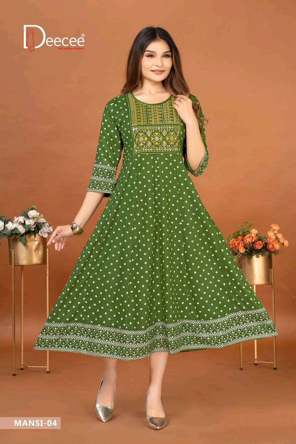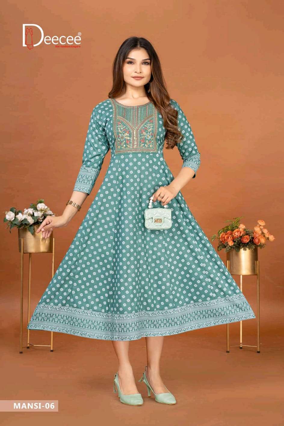 Buy Online DEECEE MANSI RAYON FLARED KALI STYLE KURTI WITH KHADI PRINT FESTIVAL WEAR DEALER 6 Pcs of Full Catalogue at Wholesale Price. Looking for DEECEE MANSI RAYON FLARED KALI STYLE KURTI WITH KHADI PRINT FESTIVAL WEAR DEALER Full Catalouge at Best Price? Buy Now DEECEE MANSI RAYON FLARED KALI STYLE KURTI WITH KHADI PRINT FESTIVAL WEAR DEALER at Wholesale Rate of Rs 2670 with Total 6 Pcs from authroized dealer and supplier of DEECEE FASHION Brand. Cost of Each piece is just only Rs 445 which is very low and affordable price to resale the product in your retail store Ethnic Export is Surat based Wholesale Supplier & Dealer of DEECEE FASHION Brand. Click on Brand name to Know more about DEECEE FASHION Brand's products.Call or Whatsapp on +91-9825759366 for booking or enquiry