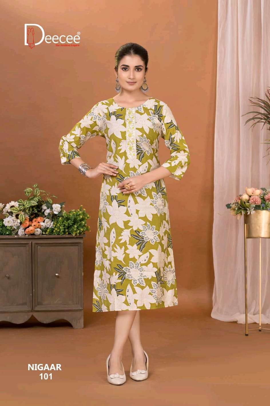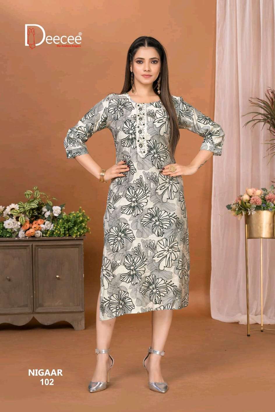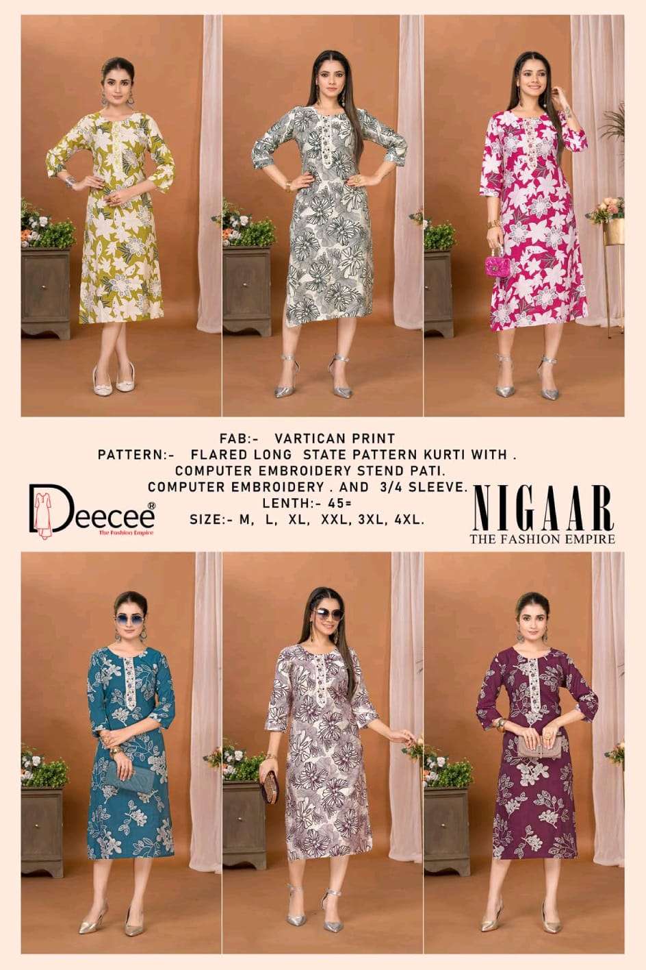 Buy Online DEECEE NIGAAR FLARED LONG PATTERN KURTI TO GIRL CLASSIC FASHION SUPPLIER 6 Pcs of Full Catalogue at Wholesale Price. Looking for DEECEE NIGAAR FLARED LONG PATTERN KURTI TO GIRL CLASSIC FASHION SUPPLIER Full Catalouge at Best Price? Buy Now DEECEE NIGAAR FLARED LONG PATTERN KURTI TO GIRL CLASSIC FASHION SUPPLIER at Wholesale Rate of Rs 2490 with Total 6 Pcs from authroized dealer and supplier of DEECEE FASHION Brand. Cost of Each piece is just only Rs 415 which is very low and affordable price to resale the product in your retail store Ethnic Export is Surat based Wholesale Supplier & Dealer of DEECEE FASHION Brand. Click on Brand name to Know more about DEECEE FASHION Brand's products.Call or Whatsapp on +91-9825759366 for booking or enquiry
