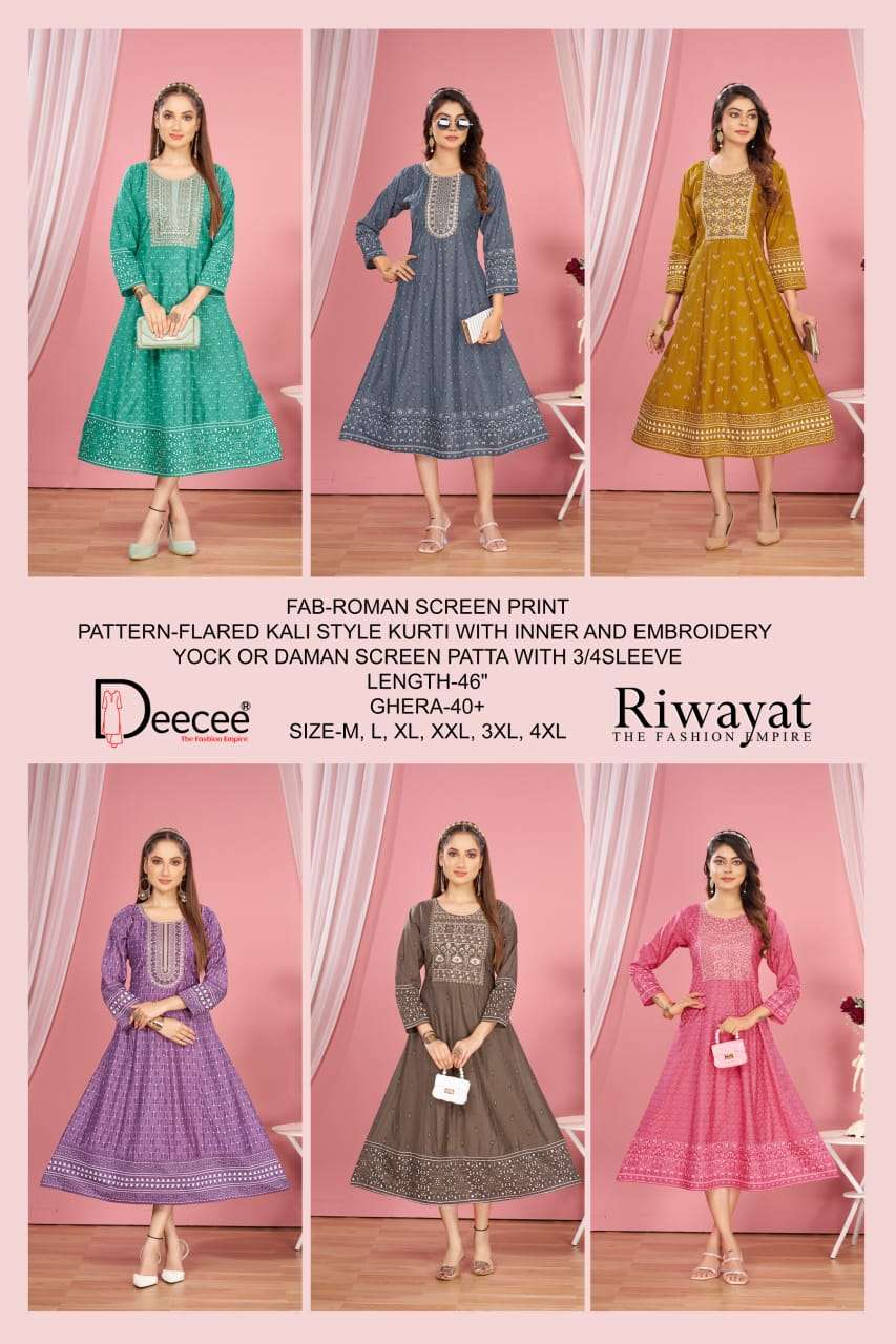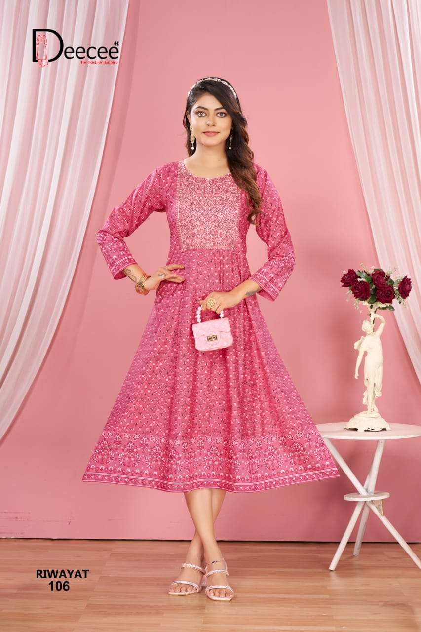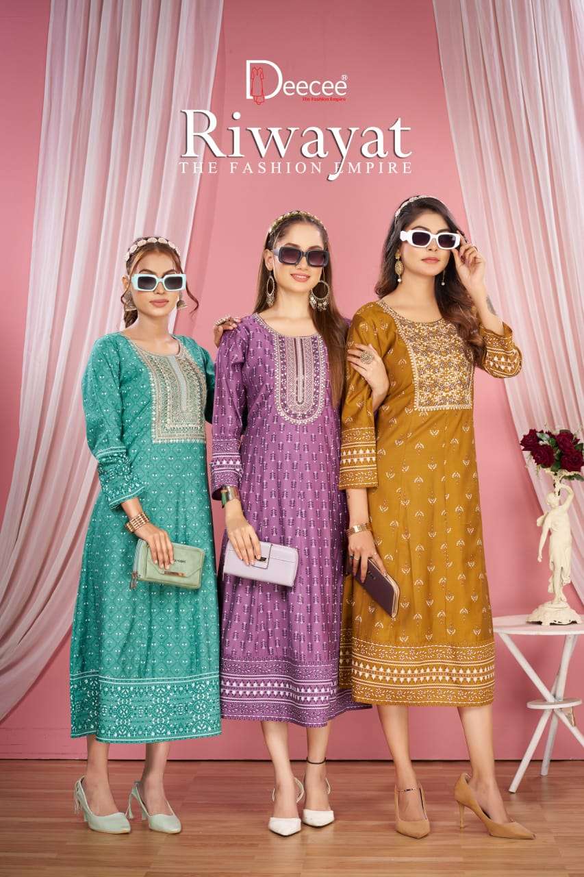 Buy Online DEECEE RIWAYAT FLARED LONG KALI PATTERN KURTI FOR GIRL DAILY WEAR SUPPLIER 6 Pcs of Full Catalogue at Wholesale Price. Looking for DEECEE RIWAYAT FLARED LONG KALI PATTERN KURTI FOR GIRL DAILY WEAR SUPPLIER Full Catalouge at Best Price? Buy Now DEECEE RIWAYAT FLARED LONG KALI PATTERN KURTI FOR GIRL DAILY WEAR SUPPLIER at Wholesale Rate of Rs 3270 with Total 6 Pcs from authroized dealer and supplier of DEECEE FASHION Brand. Cost of Each piece is just only Rs 545 which is very low and affordable price to resale the product in your retail store Ethnic Export is Surat based Wholesale Supplier & Dealer of DEECEE FASHION Brand. Click on Brand name to Know more about DEECEE FASHION Brand's products.Call or Whatsapp on +91-9825759366 for booking or enquiry