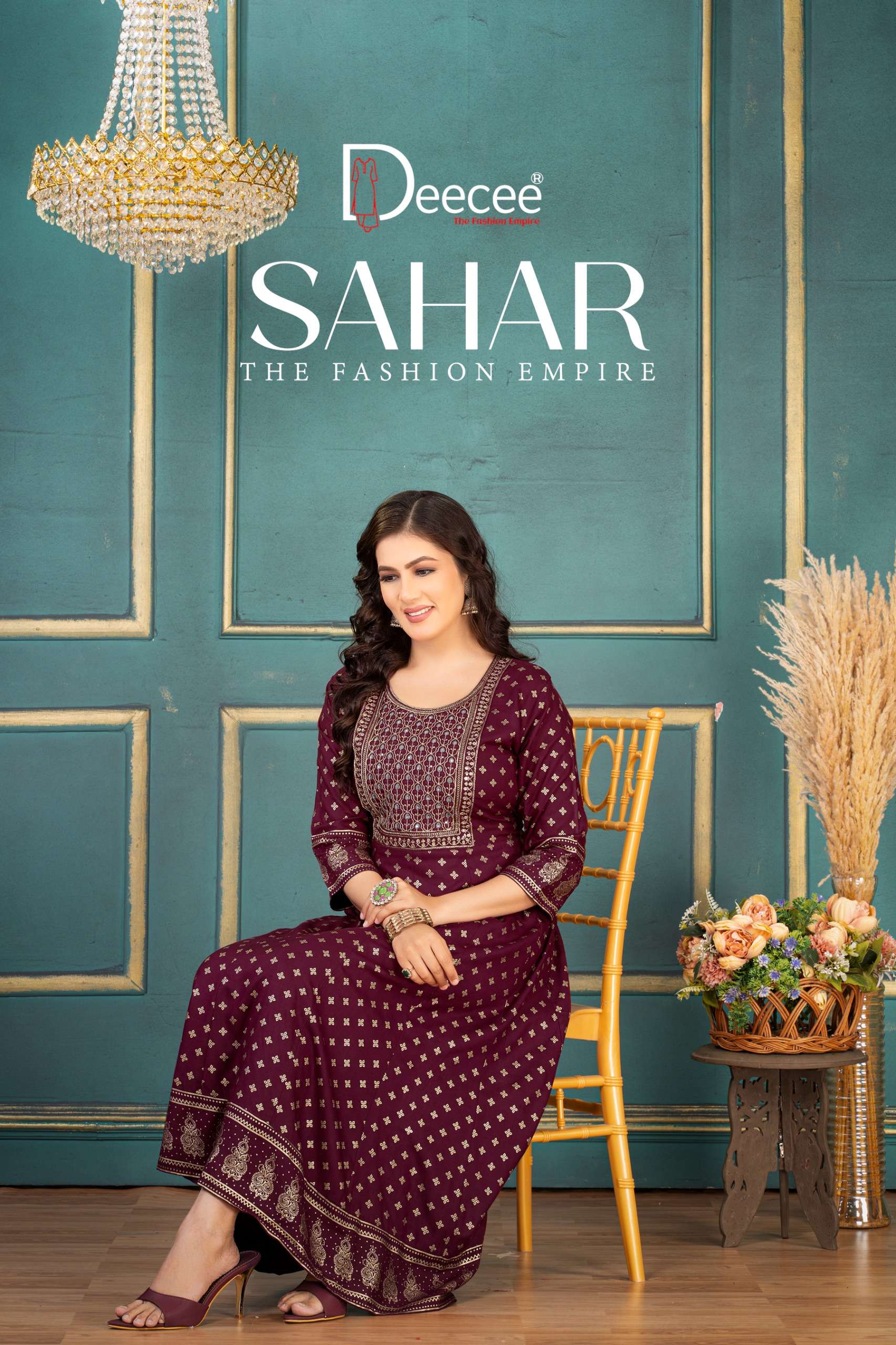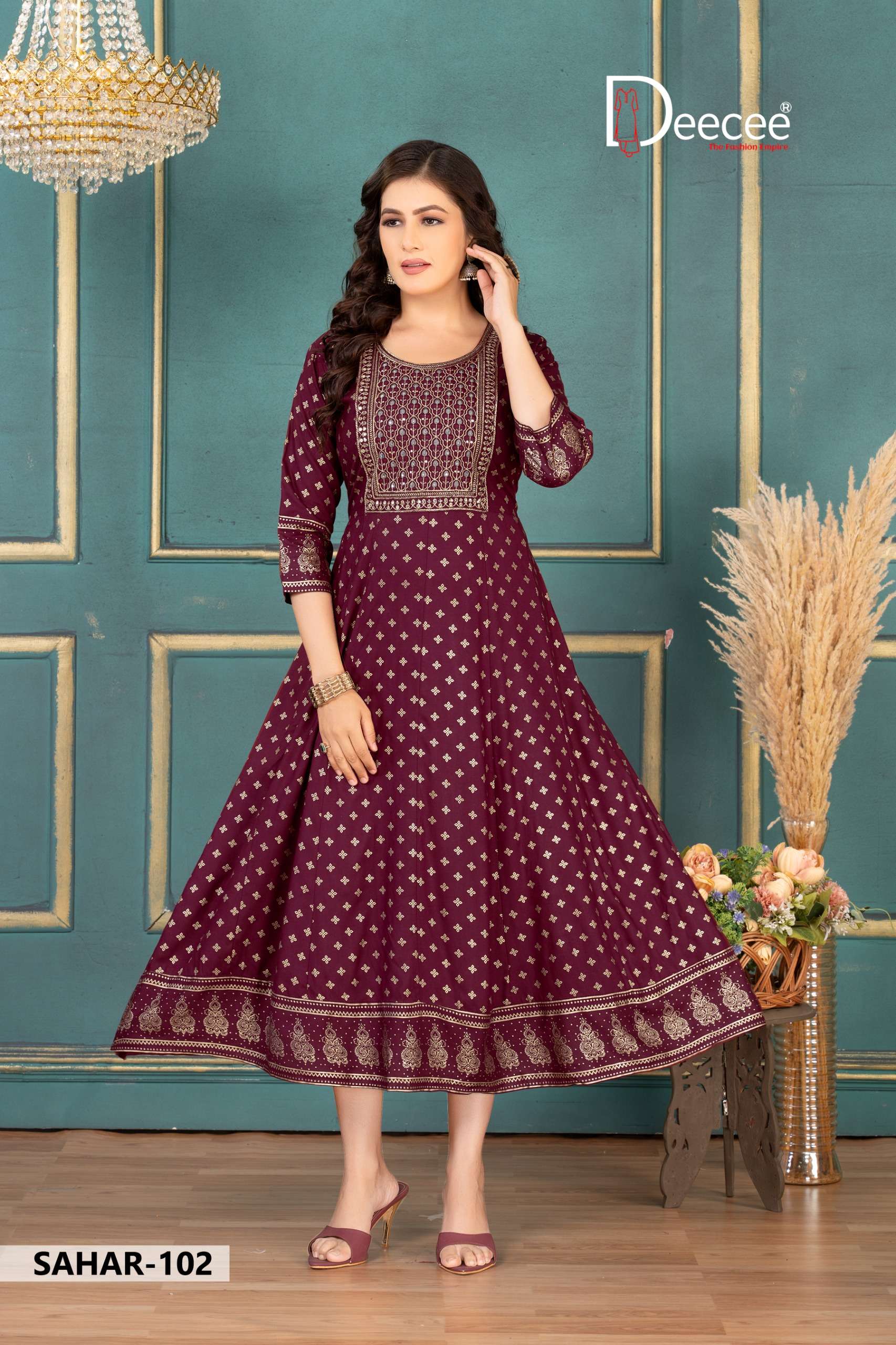 | Title | DEECEE SAHAR CLASSIC STYLE GOLD PRINT FLARED KALI KURTI SET RESELLER RATE |
