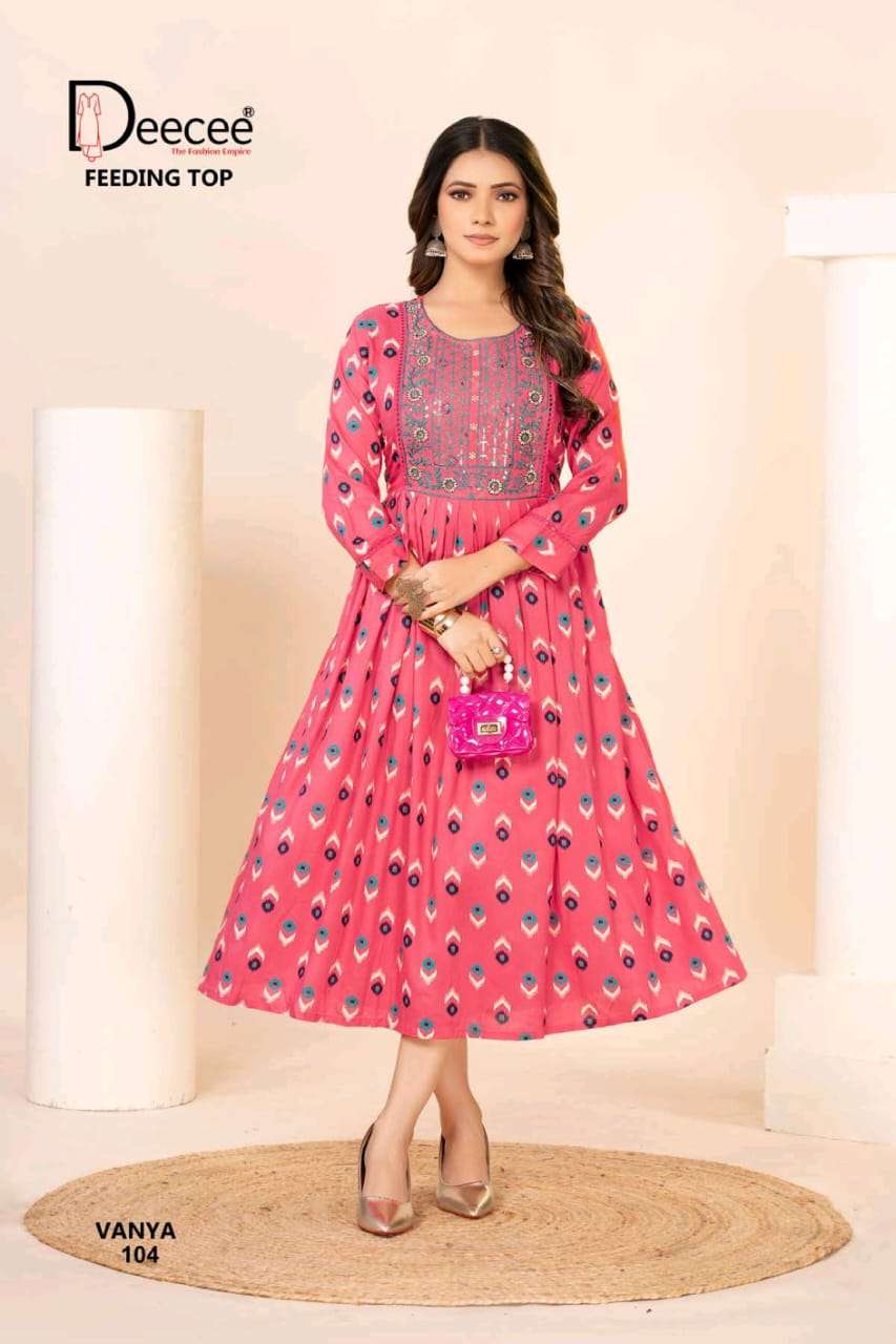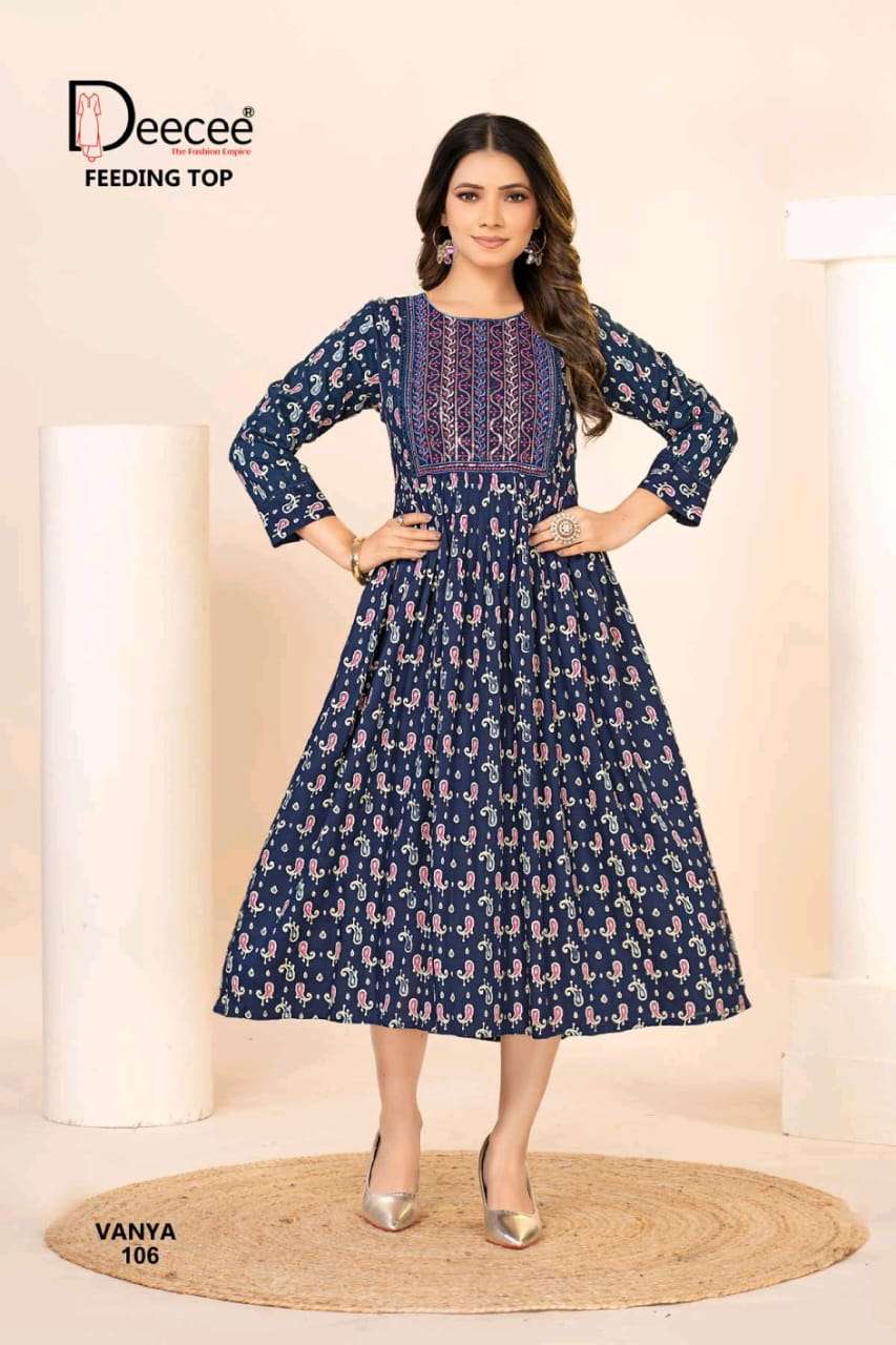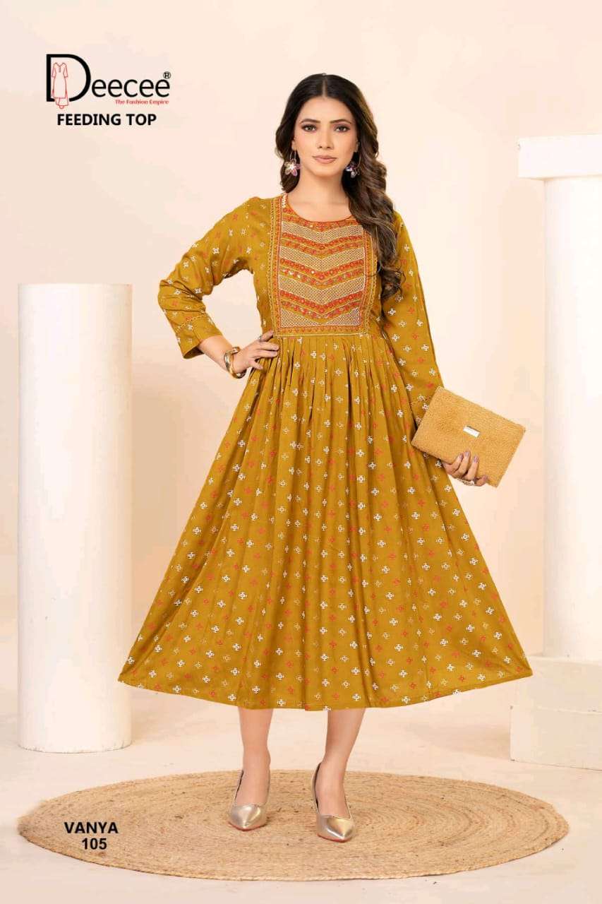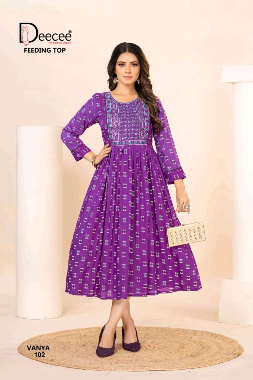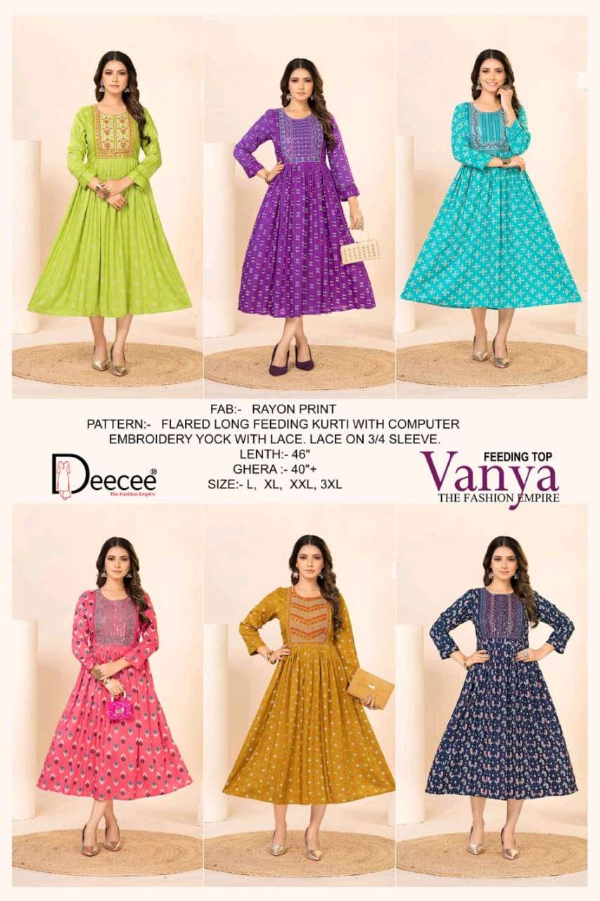 | Title | DEECEE VANYA PREMIUM RAYON PRINT LONG FLAR KURTI COLLECTION RESELLER GUJARAT |