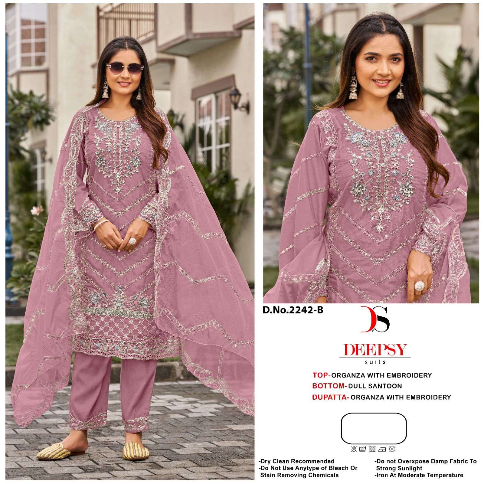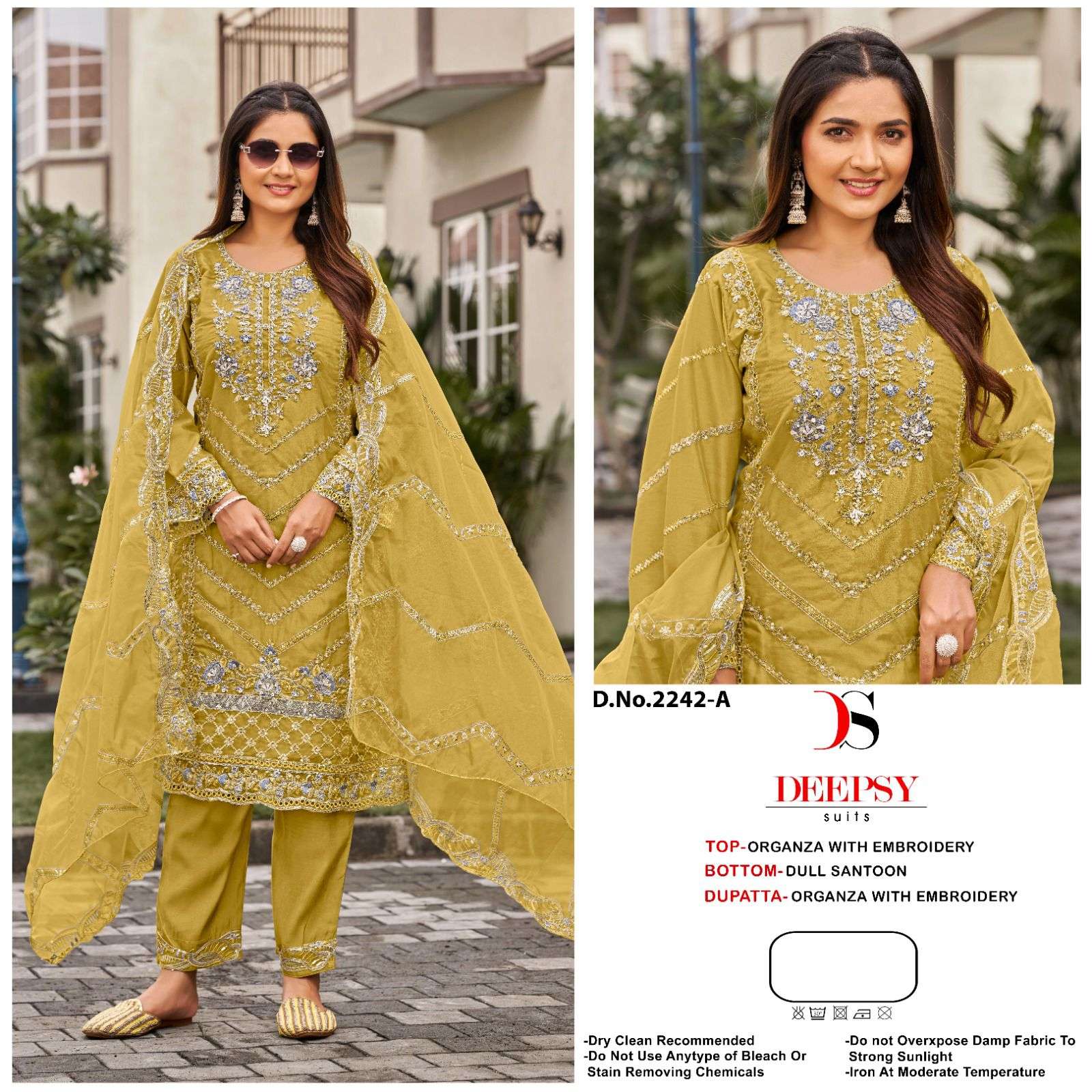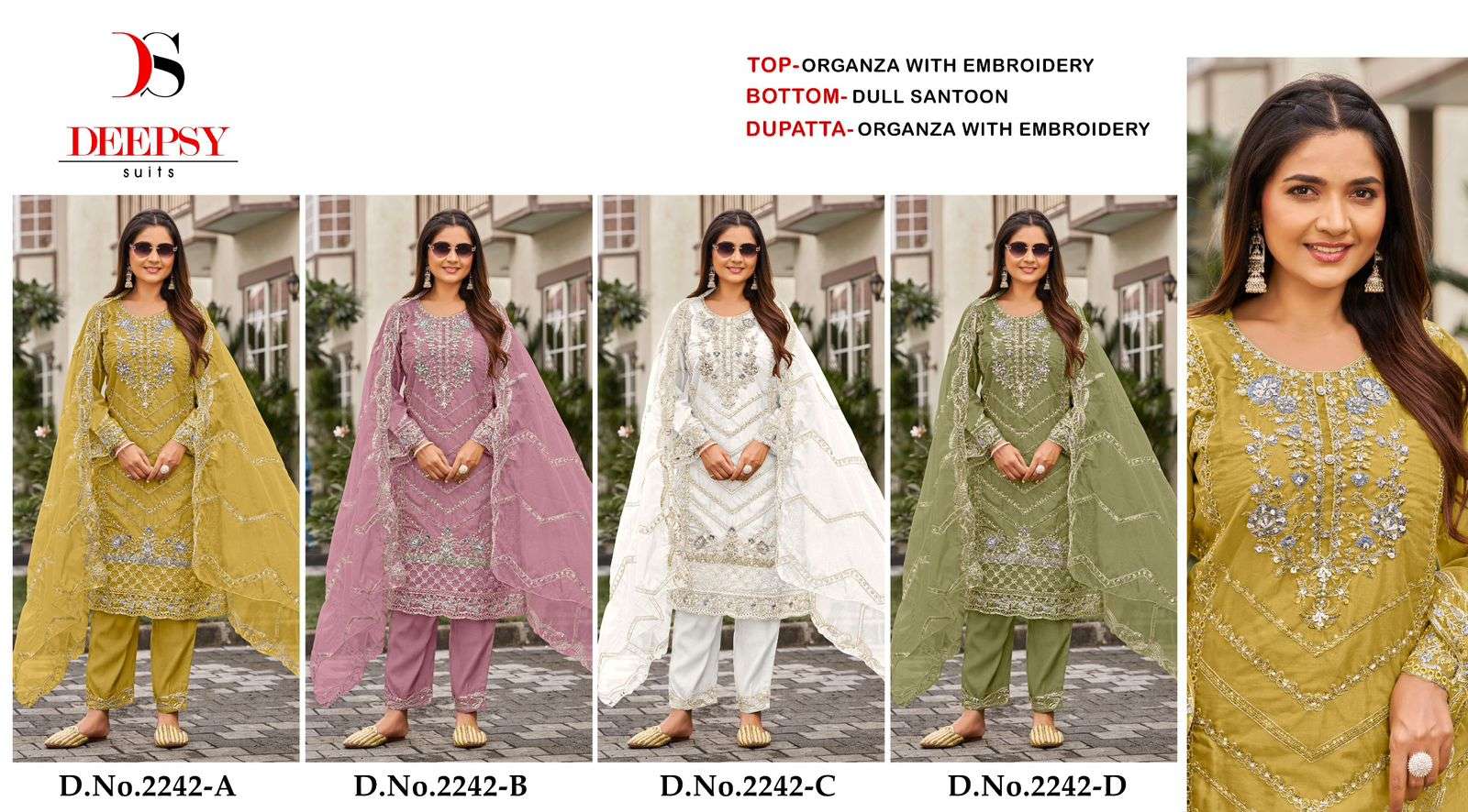 *D no.: 2242 ABCD by DEEPSY SUITS Top -organa with embroidery & khatli work (semi stich) Bot - Dull Santoon Dup - organza with embroidery Quilted Fabric Used For best quality results FULL SET ONLY |