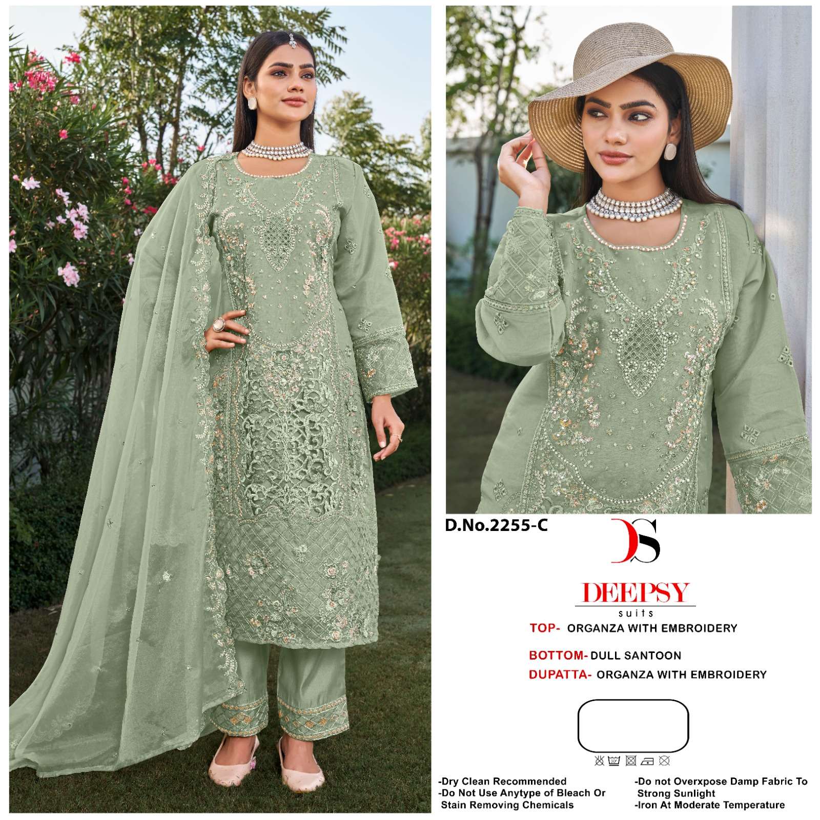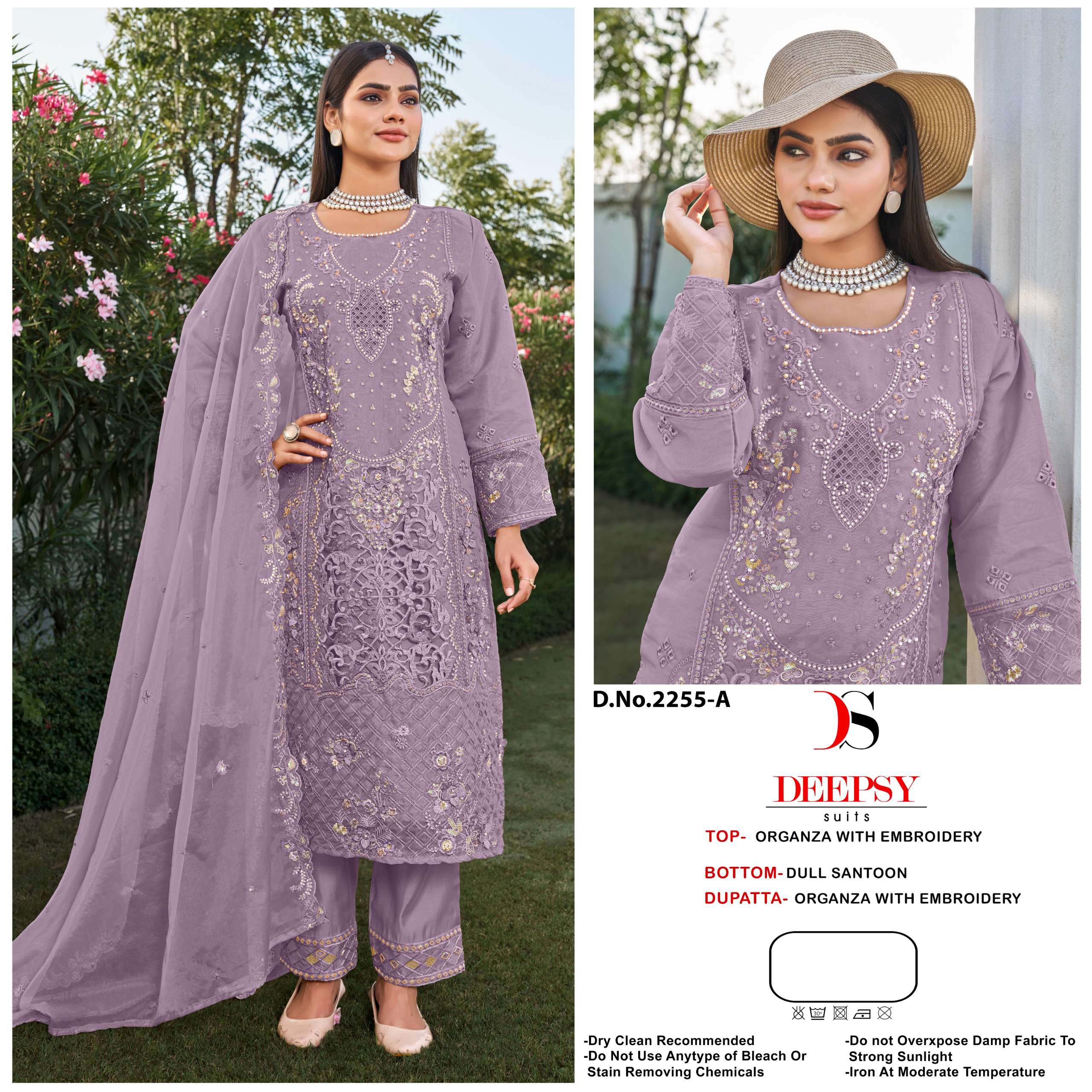 *D no.: 2255 ABCD by DEEPSY SUITS Top -organa with embroidery khatli work & cut work (semi stich) Bot - Dull Santoon Dup - organza with embroidery with FULL SET ONLY |