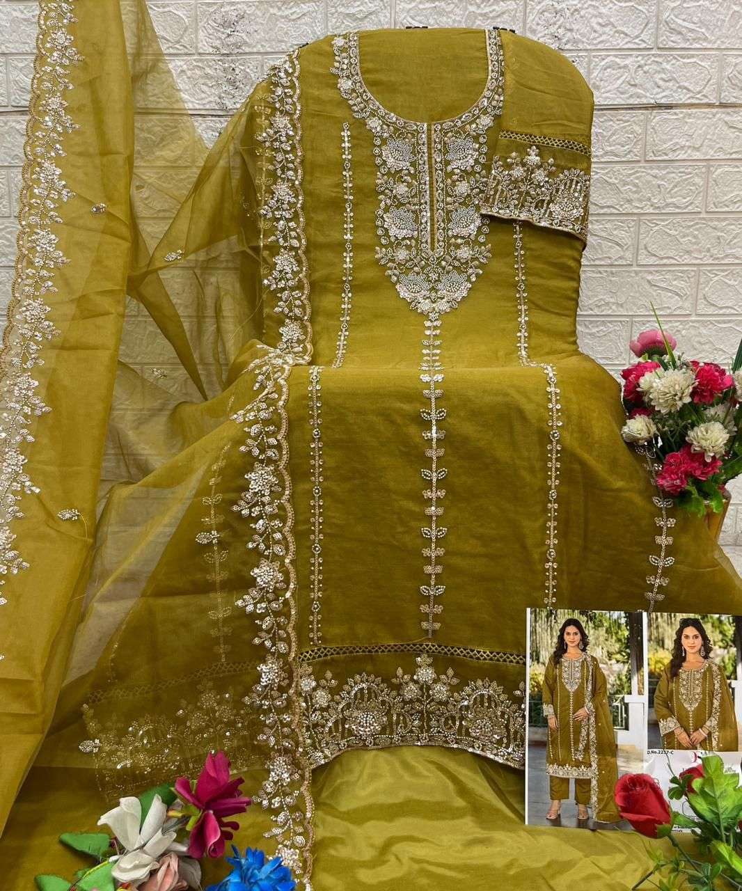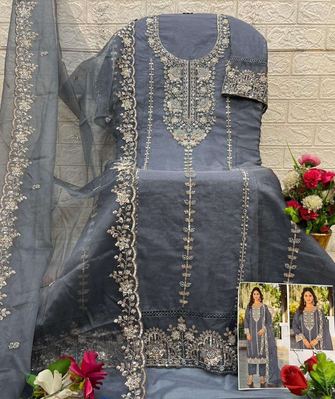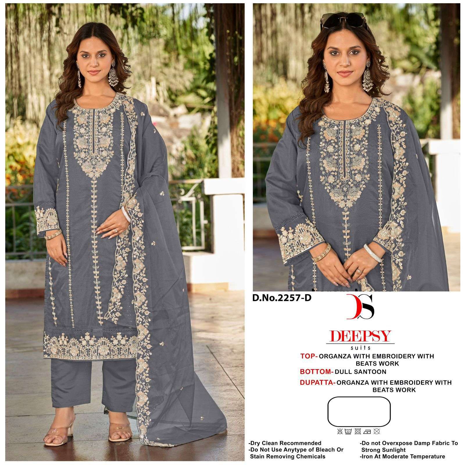 D no.: 2257 ABCD by DEEPSY SUITS Top -organa with embroidery & Bits work (semi stich) Bot - Dull Santoon Dup - organza with embroidery & Bits work FULL SET ONLY |