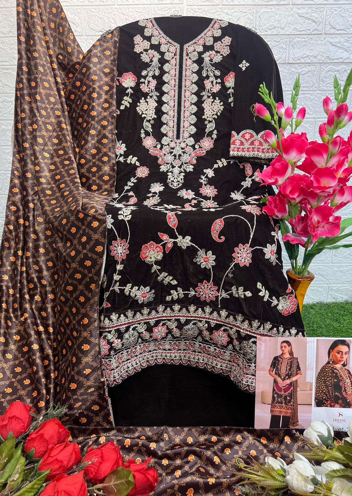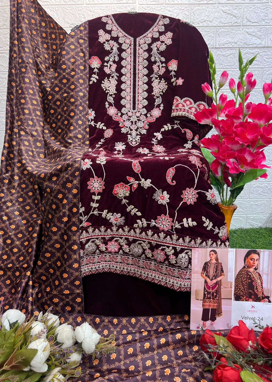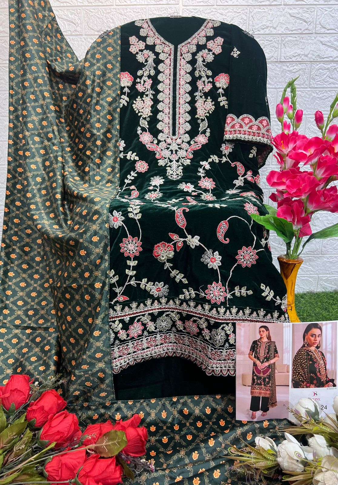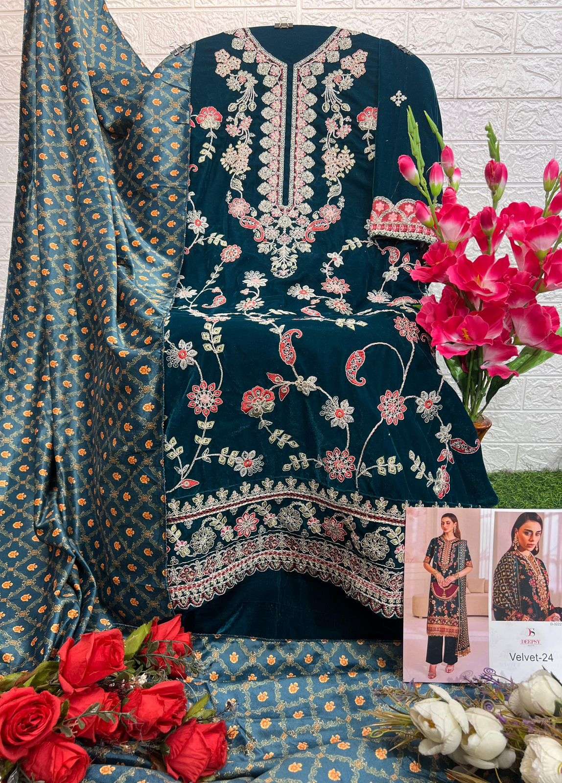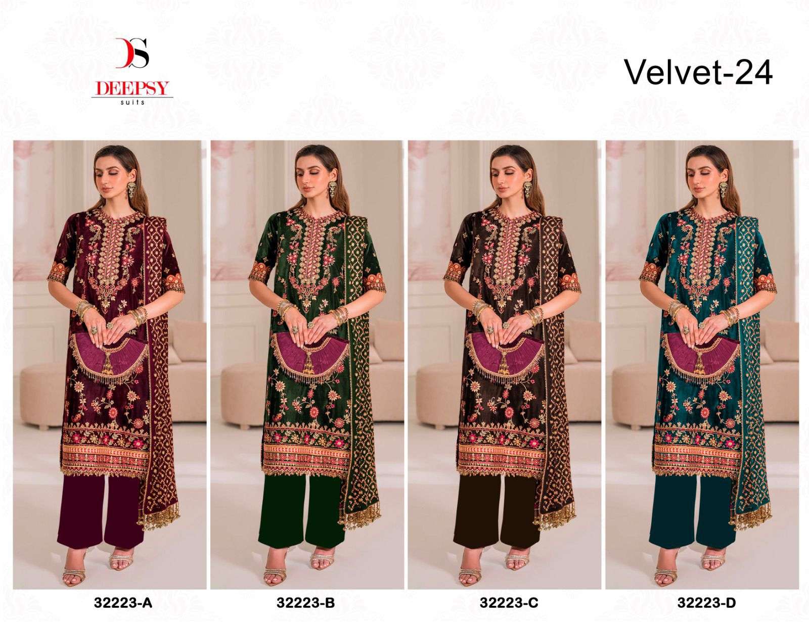 DESIGN NO.: 32223 ABCD Top - Velvet with heavy embroidery Bot - Velevt with heavy embroidery Dup - Velevt Digital print Pcs: 4 FULL SET ONLY |