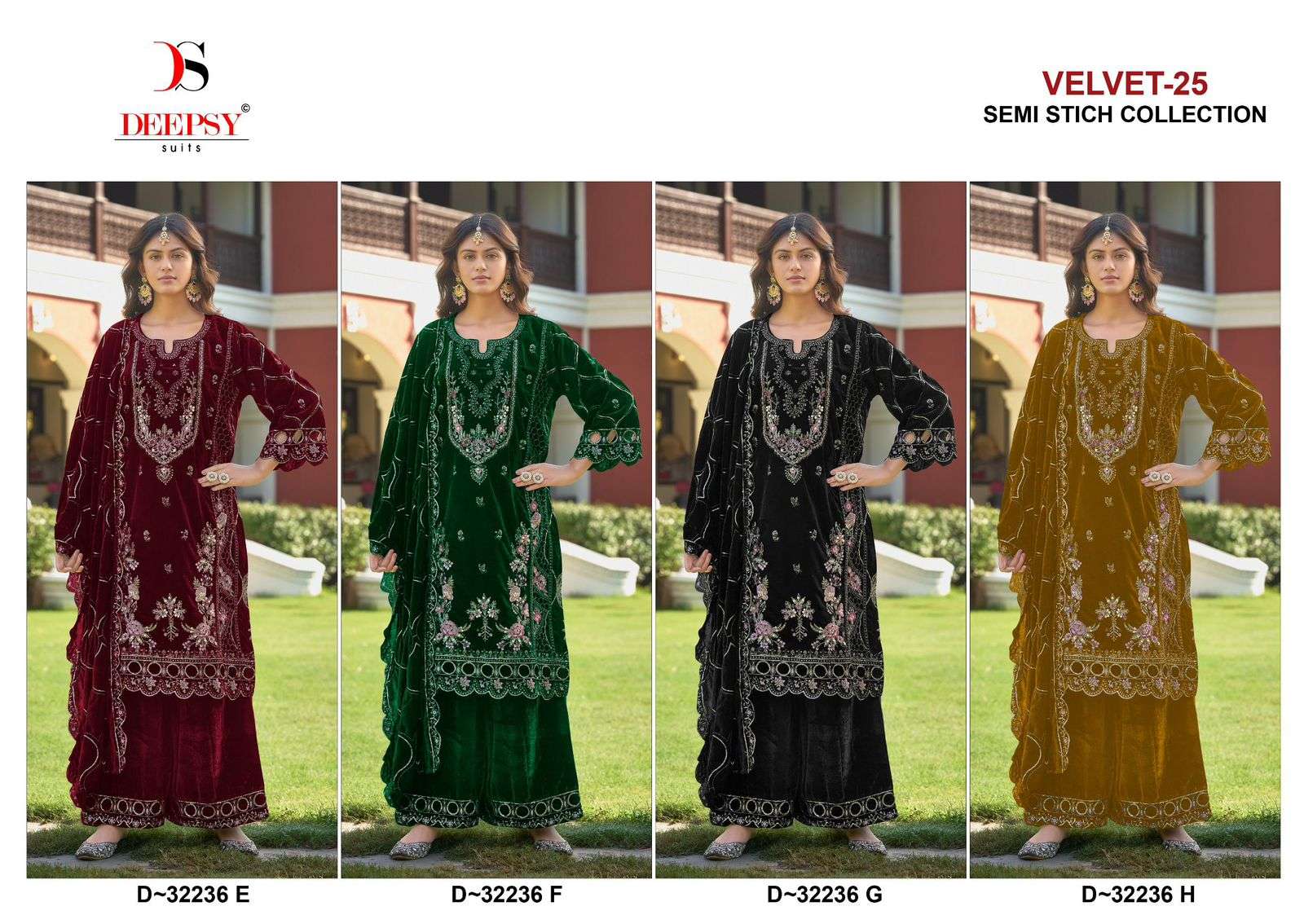 DESIGN NO.: 32236 EFGH (Semi Stich) Top -Velvet with heavy embroidery with Khatli work Bot - Velevt with embroidery Dup - Velevt with heavy embroidery Pcs: 4 FULL SET ONLY |