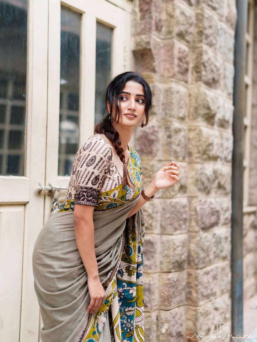 | Title | DF 238 Kalamkari printed Border With Plain Linen Fabric Saree Best Collection |