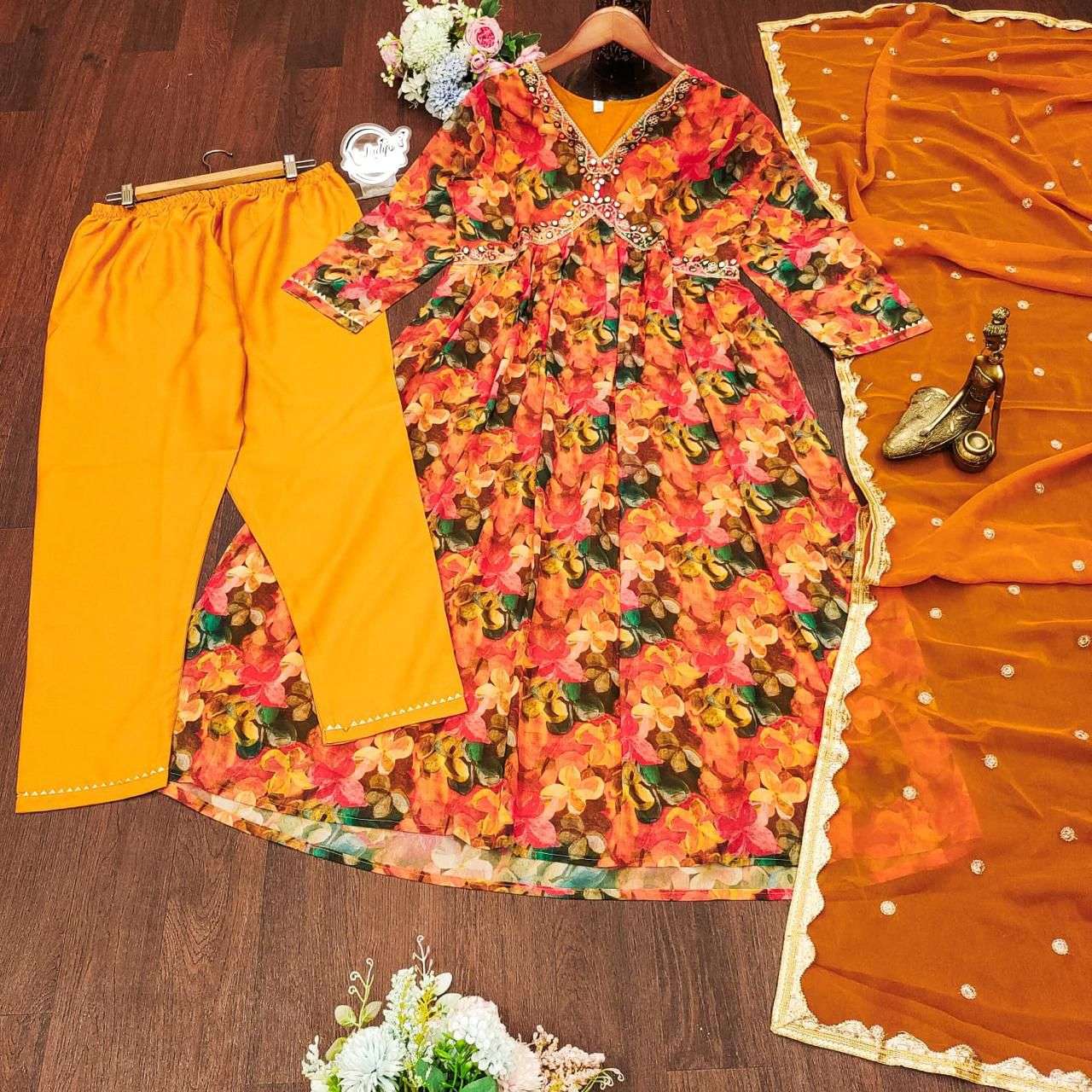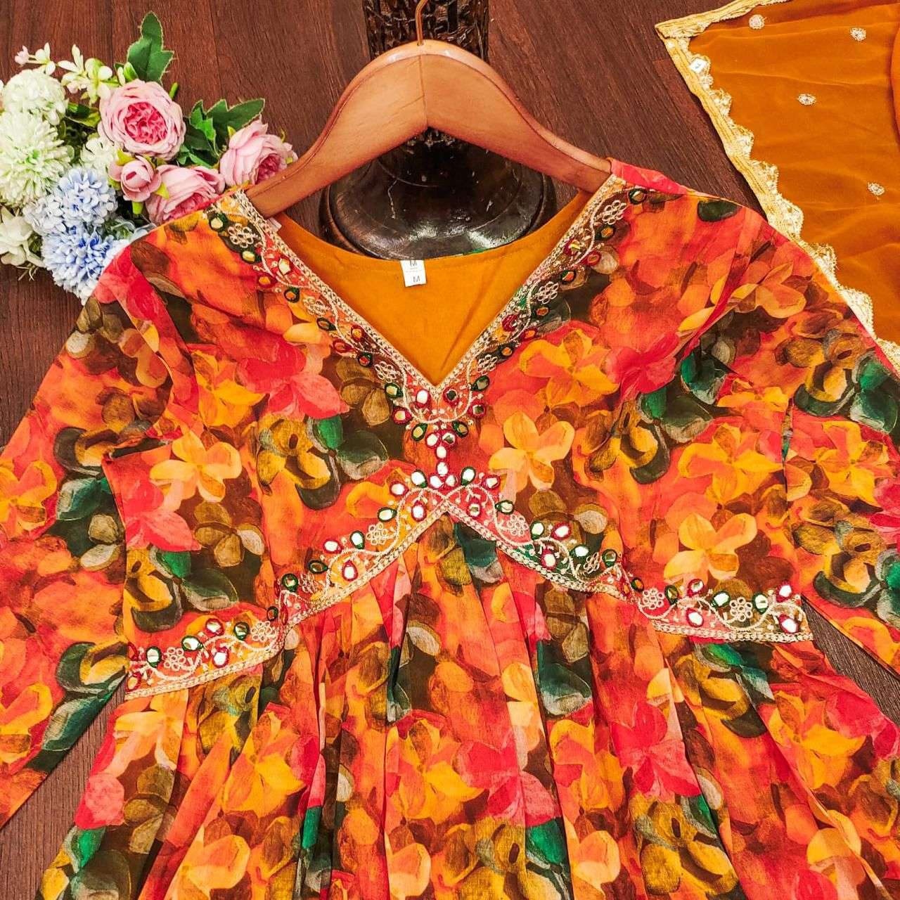Title | DIWALI PARTY CLOTHING ALIYA CUT GEORGETTE FABRIC FLORAL PRINT ORANGE SUIT ONLINE LADY |