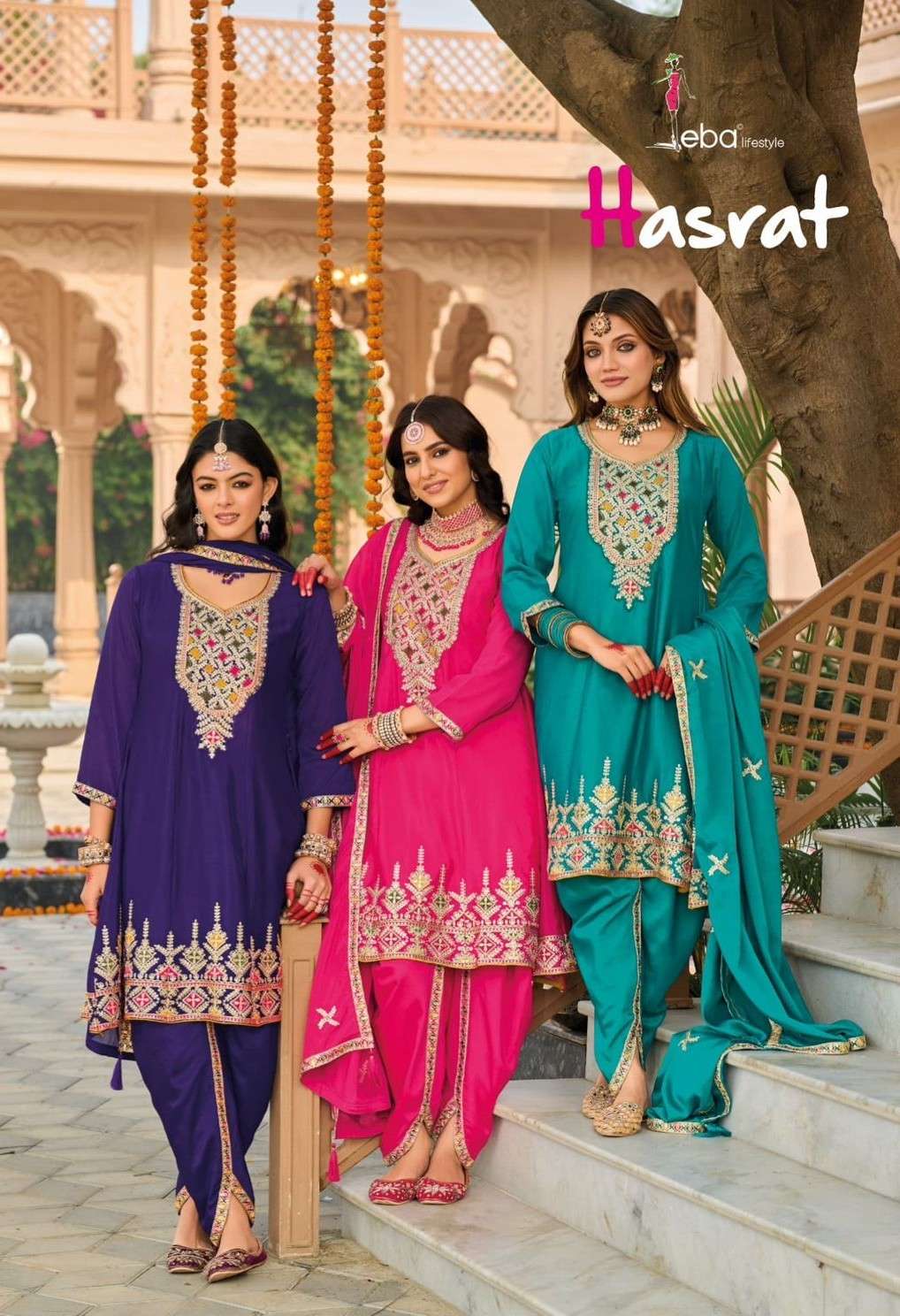 Buy Online EBA LIFESTYLE HASRAT EXCLUSIVE WEDDING NEW OUTFIT HEAVY WORK PUNJABI STYLE SUIT BRAND 3 Pcs of Full Catalogue at Wholesale Price. Looking for EBA LIFESTYLE HASRAT EXCLUSIVE WEDDING NEW OUTFIT HEAVY WORK PUNJABI STYLE SUIT BRAND Full Catalouge at Best Price? Buy Now EBA LIFESTYLE HASRAT EXCLUSIVE WEDDING NEW OUTFIT HEAVY WORK PUNJABI STYLE SUIT BRAND at Wholesale Rate of Rs 5997 with Total 3 Pcs from authroized dealer and supplier of Eba Lifestyle Brand. Cost of Each piece is just only Rs 1999 which is very low and affordable price to resale the product in your retail store Ethnic Export is Surat based Wholesale Supplier & Dealer of Eba Lifestyle Brand. Click on Brand name to Know more about Eba Lifestyle Brand's products.Call or Whatsapp on +91-9825759366 for booking or enquiry