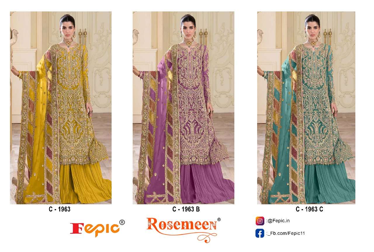 Buy Online FEPIC ROSEMEEN 1963 ATTRACTIVE HEAVY WORK PAKISTANI COPY FARSHI SALWAR SUIT TREND EXPORT 3 Pcs of Full Catalogue at Wholesale Price. Looking for FEPIC ROSEMEEN 1963 ATTRACTIVE HEAVY WORK PAKISTANI COPY FARSHI SALWAR SUIT TREND EXPORT Full Catalouge at Best Price? Buy Now FEPIC ROSEMEEN 1963 ATTRACTIVE HEAVY WORK PAKISTANI COPY FARSHI SALWAR SUIT TREND EXPORT at Wholesale Rate of Rs 3807 with Total 3 Pcs from authroized dealer and supplier of Fepic Brand. Cost of Each piece is just only Rs 1269 which is very low and affordable price to resale the product in your retail store Ethnic Export is Surat based Wholesale Supplier & Dealer of Fepic Brand. Click on Brand name to Know more about Fepic Brand's products.Call or Whatsapp on +91-9825759366 for booking or enquiry