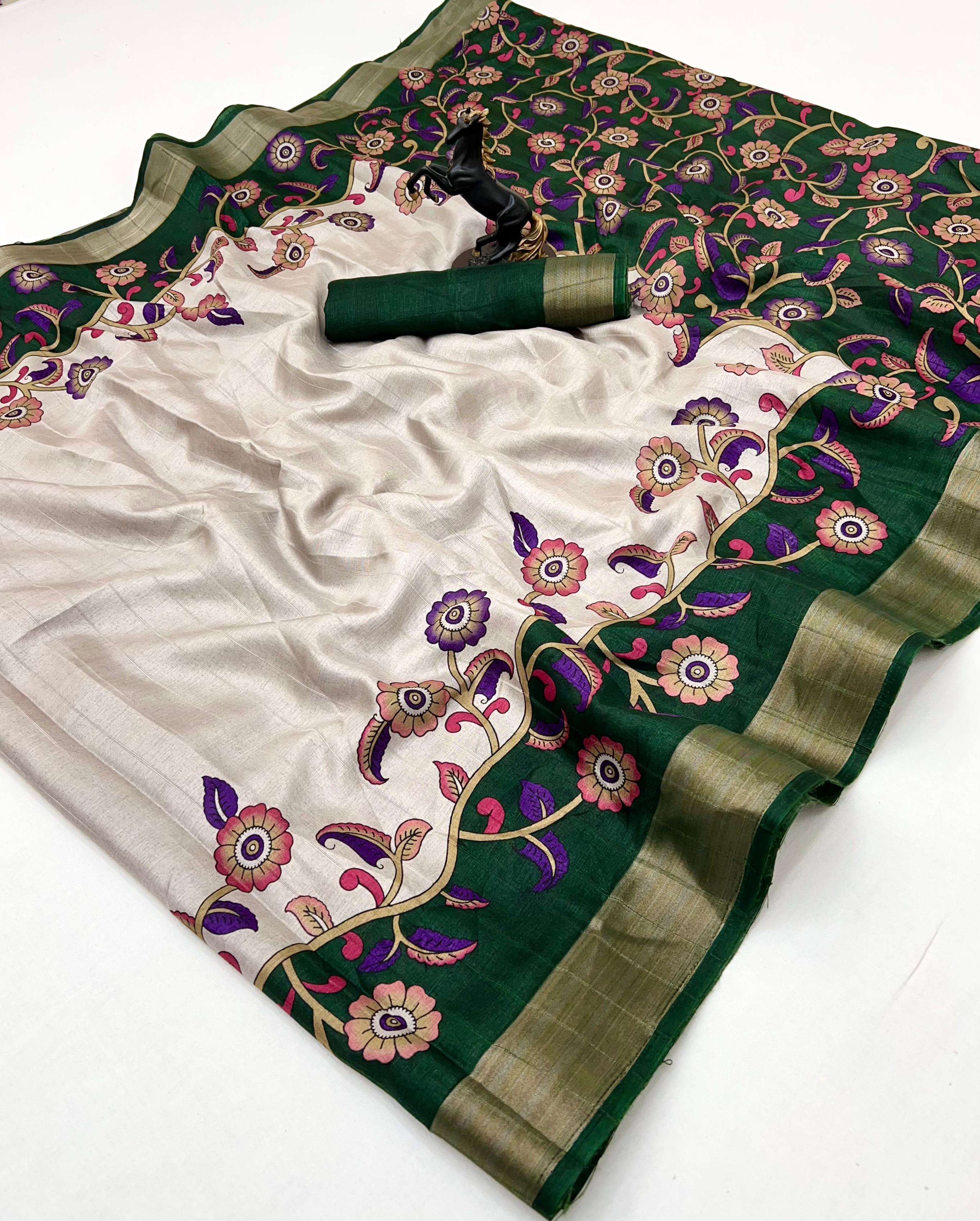 evate your ethnic wardrobe with this exquisite silk saree, featuring a rich combination of off-white and vibrant magenta. Adorned with intricate floral embroidery in hues of yellow, purple, and beige, this saree seamlessly blends traditional charm with modern elegance.