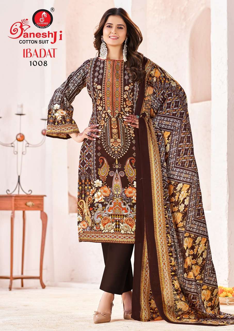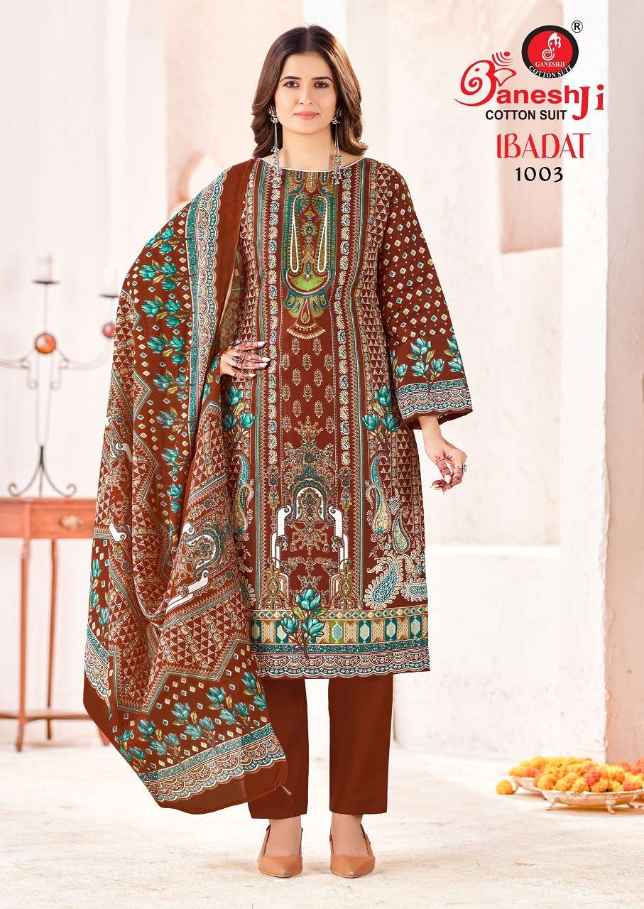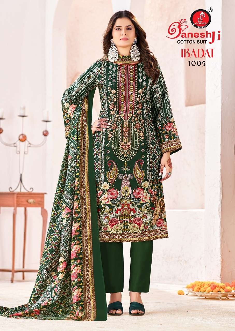 Buy Online GANESHJI IBADAT VOL 1 KARACHI DESIGN COTTON MATERIAL PAKISTANI SUIT DEALER INDIA 8 Pcs of Full Catalogue at Wholesale Price. Looking for GANESHJI IBADAT VOL 1 KARACHI DESIGN COTTON MATERIAL PAKISTANI SUIT DEALER INDIA Full Catalouge at Best Price? Buy Now GANESHJI IBADAT VOL 1 KARACHI DESIGN COTTON MATERIAL PAKISTANI SUIT DEALER INDIA at Wholesale Rate of Rs 2200 with Total 8 Pcs from authroized dealer and supplier of GANESH JI SUITS Brand. Cost of Each piece is just only Rs 275 which is very low and affordable price to resale the product in your retail store Ethnic Export is Surat based Wholesale Supplier & Dealer of GANESH JI SUITS Brand. Click on Brand name to Know more about GANESH JI SUITS Brand's products.Call or Whatsapp on +91-9825759366 for booking or enquiry