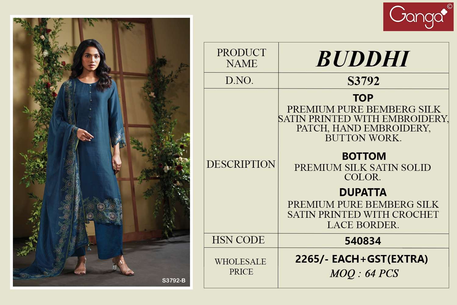 Buy Online GANGA BUDDHI 3792 PURE BEMBERG SILK SATIN PRINTED EXCLUSIVE SUIT FOR WOMEN CLOTHING 2 Pcs of Full Catalogue at Wholesale Price. Looking for GANGA BUDDHI 3792 PURE BEMBERG SILK SATIN PRINTED EXCLUSIVE SUIT FOR WOMEN CLOTHING Full Catalouge at Best Price? Buy Now GANGA BUDDHI 3792 PURE BEMBERG SILK SATIN PRINTED EXCLUSIVE SUIT FOR WOMEN CLOTHING at Wholesale Rate of Rs 4530 with Total 2 Pcs from authroized dealer and supplier of Ganga Fashions Brand. Cost of Each piece is just only Rs 2265 which is very low and affordable price to resale the product in your retail store Ethnic Export is Surat based Wholesale Supplier & Dealer of Ganga Fashions Brand. Click on Brand name to Know more about Ganga Fashions Brand's products.Call or Whatsapp on +91-9825759366 for booking or enquiry
