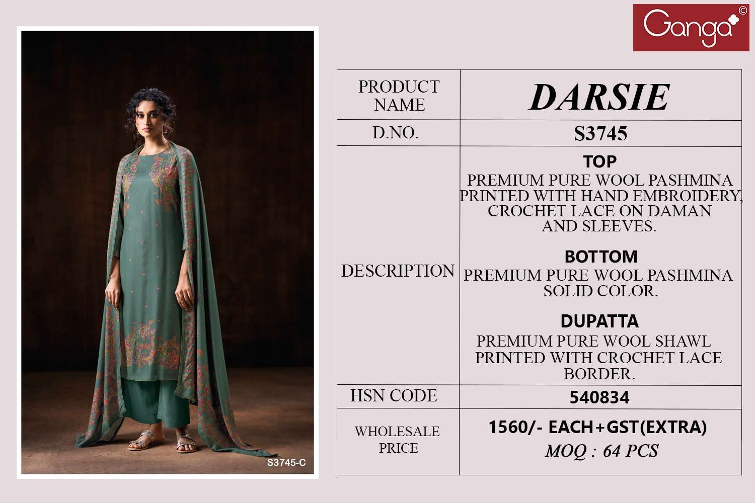 | Title | GANGA DARSIE 3745 WOOL PASHMINA PRINTED WITH HANDWORK SALWAR SUIT RESELLER |