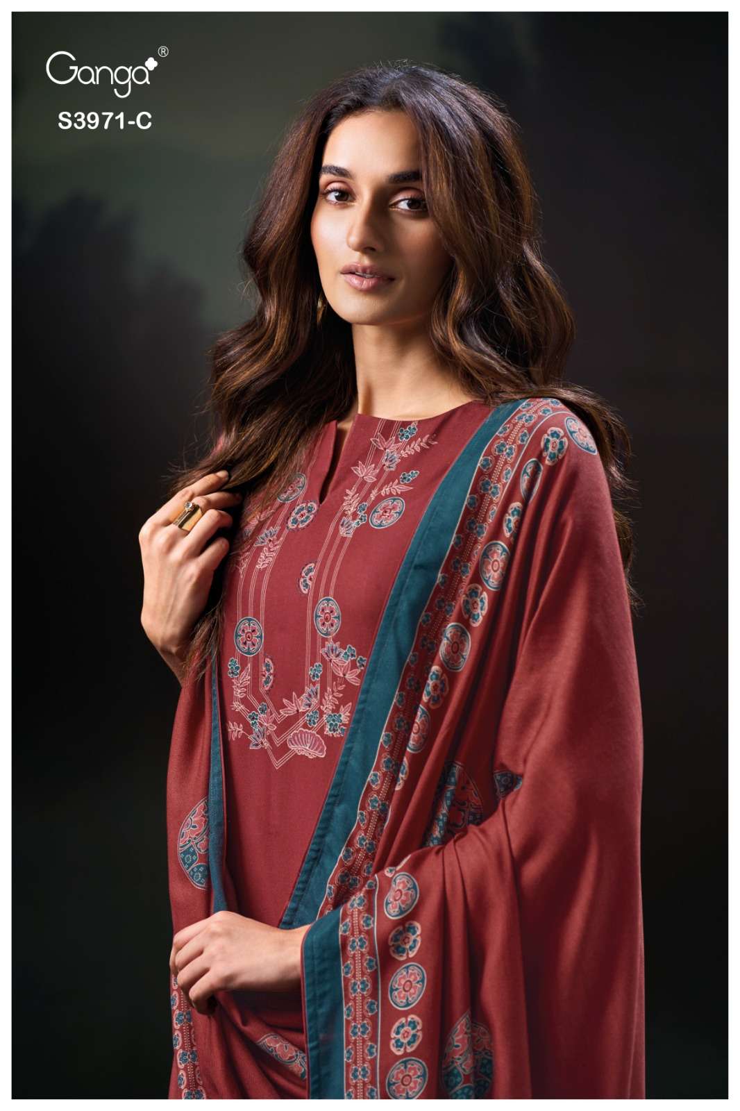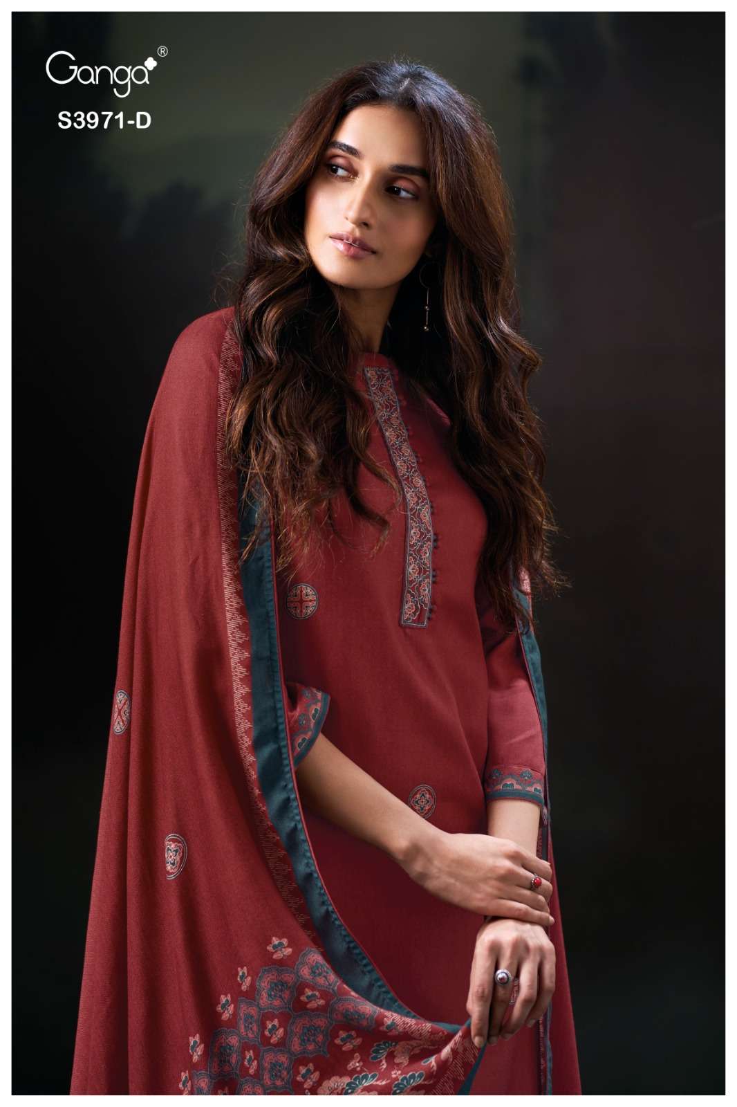 GANGA EVANI 3971 PURE WOOL PASHMINA PRINTED HANDWORK SCHIFFLI LACE SALWAR SUIT DEALER