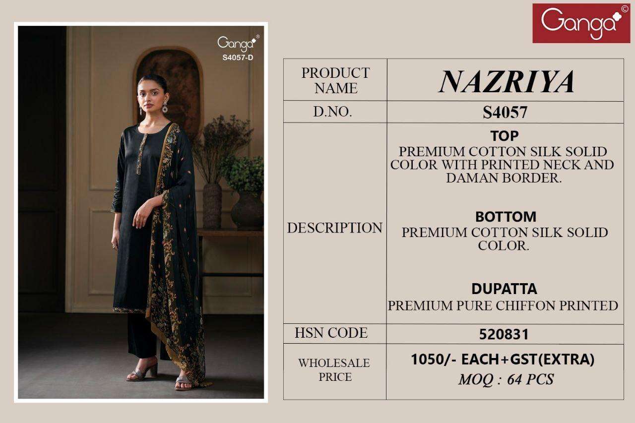 Buy Online GANGA NAZRIYA 4057 PREMIUM COTTON SILK SOLID COLOR WOMEN SUIT TO BRAND DEALER 4 Pcs of Full Catalogue at Wholesale Price. Looking for GANGA NAZRIYA 4057 PREMIUM COTTON SILK SOLID COLOR WOMEN SUIT TO BRAND DEALER Full Catalouge at Best Price? Buy Now GANGA NAZRIYA 4057 PREMIUM COTTON SILK SOLID COLOR WOMEN SUIT TO BRAND DEALER at Wholesale Rate of Rs 4200 with Total 4 Pcs from authroized dealer and supplier of Ganga Fashions Brand. Cost of Each piece is just only Rs 1050 which is very low and affordable price to resale the product in your retail store Ethnic Export is Surat based Wholesale Supplier & Dealer of Ganga Fashions Brand. Click on Brand name to Know more about Ganga Fashions Brand's products.Call or Whatsapp on +91-9825759366 for booking or enquiry