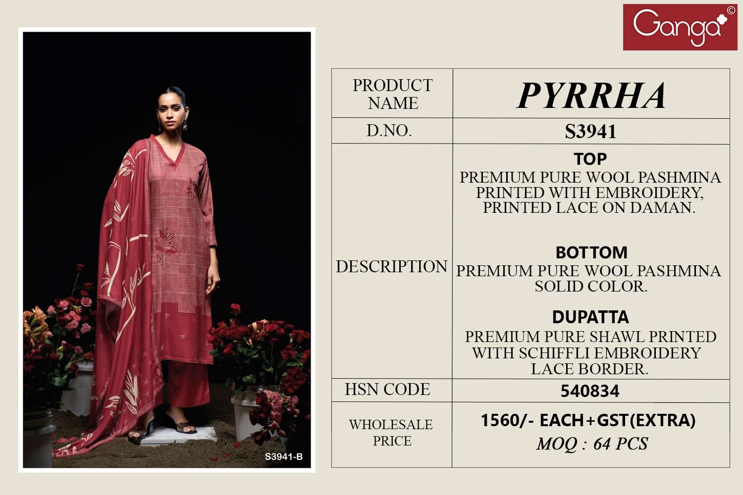 Buy Online GANGA PYRRHA 3941 WOOL PASHMINA PRINTED EMBROIDERY LACE SUIT TO PARTY STYLISH RESELLER 4 Pcs of Full Catalogue at Wholesale Price. Looking for GANGA PYRRHA 3941 WOOL PASHMINA PRINTED EMBROIDERY LACE SUIT TO PARTY STYLISH RESELLER Full Catalouge at Best Price? Buy Now GANGA PYRRHA 3941 WOOL PASHMINA PRINTED EMBROIDERY LACE SUIT TO PARTY STYLISH RESELLER at Wholesale Rate of Rs 6240 with Total 4 Pcs from authroized dealer and supplier of Ganga Fashions Brand. Cost of Each piece is just only Rs 1560 which is very low and affordable price to resale the product in your retail store Ethnic Export is Surat based Wholesale Supplier & Dealer of Ganga Fashions Brand. Click on Brand name to Know more about Ganga Fashions Brand's products.Call or Whatsapp on +91-9825759366 for booking or enquiry