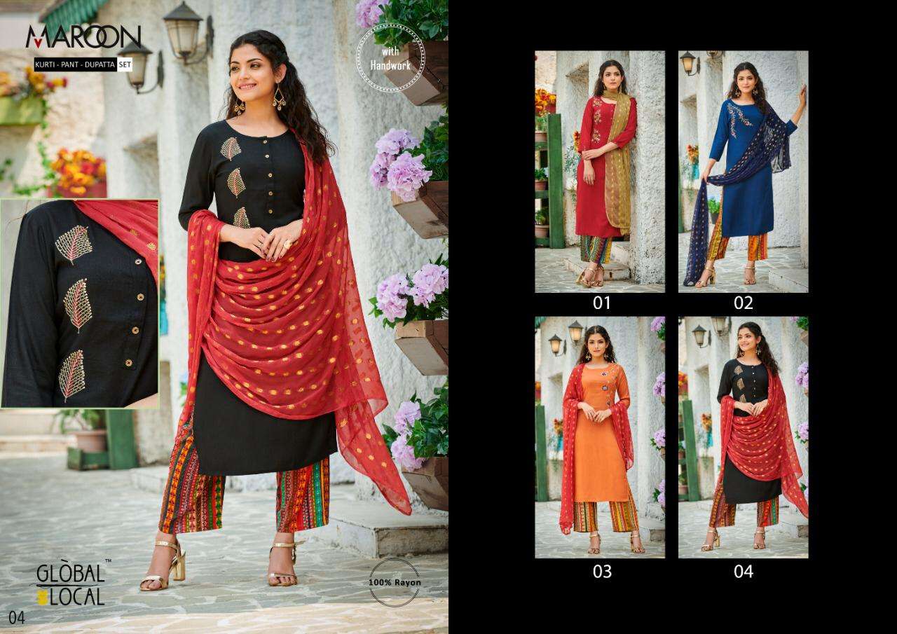 GLOBAL LOCAL MAROON RAYON WITH HAND WORK KURTI WITH PANT DUPATTA COLLECTION
