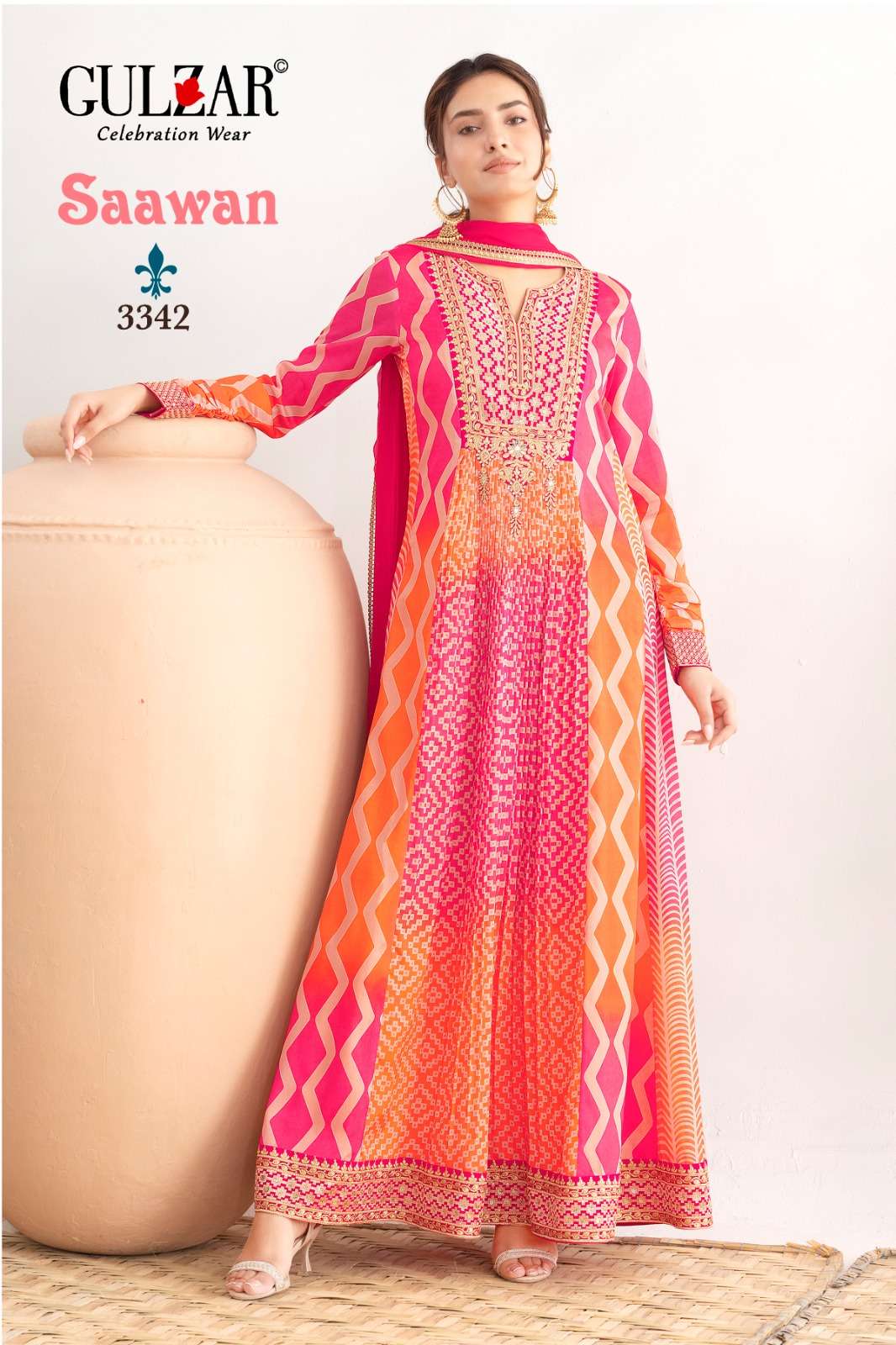 Buy Online Gulzar Saawan long Anarkali Style Chinon Silk Designer Suits Best Collection 3 Pcs of Full Catalogue at Wholesale Price. Looking for Gulzar Saawan long Anarkali Style Chinon Silk Designer Suits Best Collection Full Catalouge at Best Price? Buy Now Gulzar Saawan long Anarkali Style Chinon Silk Designer Suits Best Collection at Wholesale Rate of Rs 6885 with Total 3 Pcs from authroized dealer and supplier of GULZAR Brand. Cost of Each piece is just only Rs 2295 which is very low and affordable price to resale the product in your retail store Ethnic Export is Surat based Wholesale Supplier & Dealer of GULZAR Brand. Click on Brand name to Know more about GULZAR Brand's products.Call or Whatsapp on +91-9825759366 for booking or enquiry