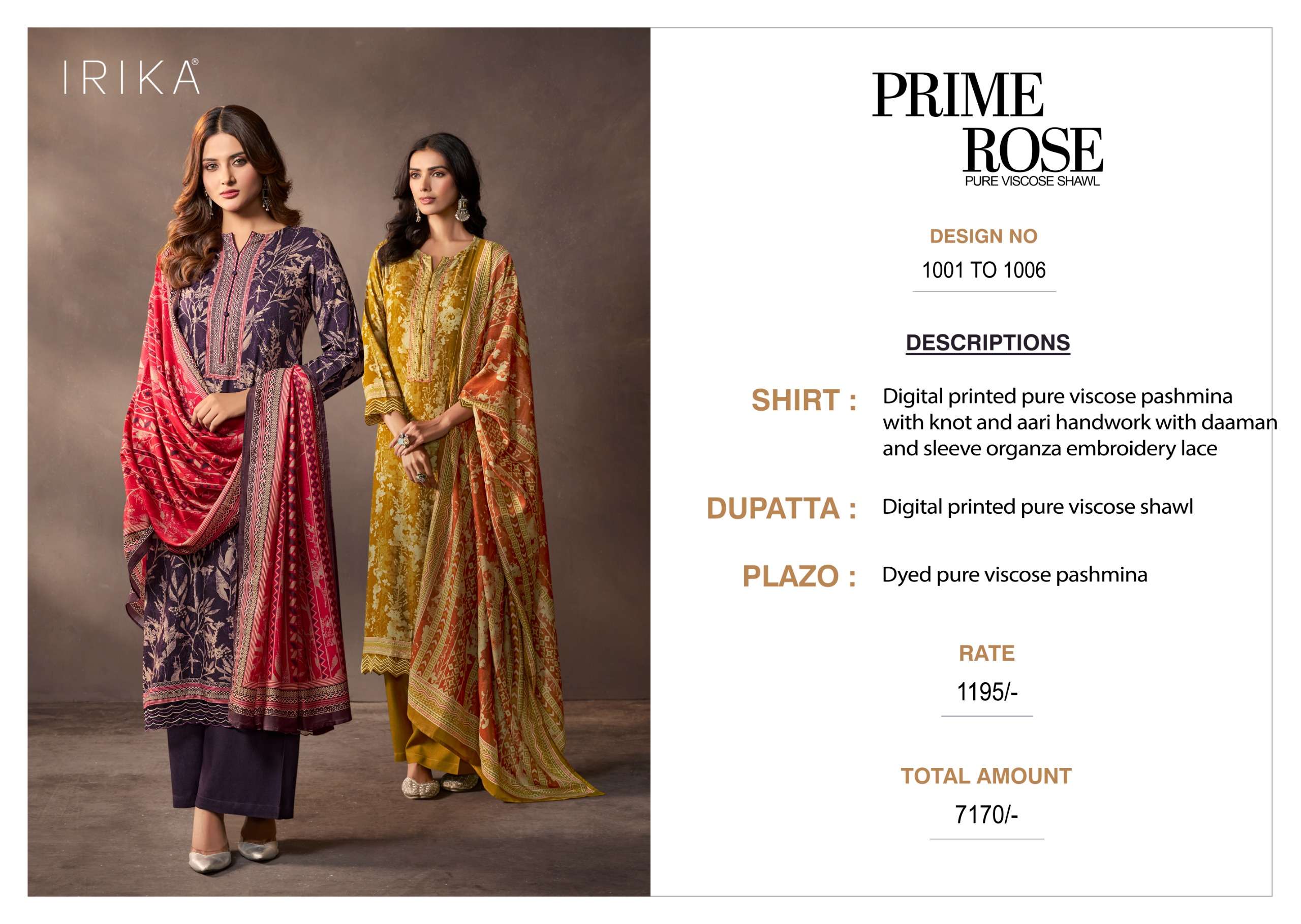 Buy Online IRIKA PRIME ROSE DIGITAL PASHMINA DESIGN SALWAR SUIT TO HIGH BRAND CLOTH INDIA 6 Pcs of Full Catalogue at Wholesale Price. Looking for IRIKA PRIME ROSE DIGITAL PASHMINA DESIGN SALWAR SUIT TO HIGH BRAND CLOTH INDIA Full Catalouge at Best Price? Buy Now IRIKA PRIME ROSE DIGITAL PASHMINA DESIGN SALWAR SUIT TO HIGH BRAND CLOTH INDIA at Wholesale Rate of Rs 7170 with Total 6 Pcs from authroized dealer and supplier of Brand. Cost of Each piece is just only Rs 1195 which is very low and affordable price to resale the product in your retail store Ethnic Export is Surat based Wholesale Supplier & Dealer of Brand. Click on Brand name to Know more about Brand's products.Call or Whatsapp on +91-9825759366 for booking or enquiry