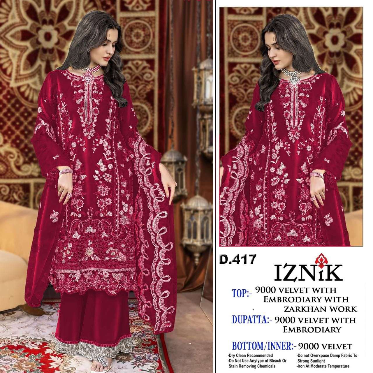 Buy Online IZNIK FAB A 417 INDIAN TOP PAKISTANI STYLE DRESS WOMEN VELVET HEAVY WORK SUIT BUY 4 Pcs of Full Catalogue at Wholesale Price. Looking for IZNIK FAB A 417 INDIAN TOP PAKISTANI STYLE DRESS WOMEN VELVET HEAVY WORK SUIT BUY Full Catalouge at Best Price? Buy Now IZNIK FAB A 417 INDIAN TOP PAKISTANI STYLE DRESS WOMEN VELVET HEAVY WORK SUIT BUY at Wholesale Rate of Rs 6600 with Total 4 Pcs from authroized dealer and supplier of IZNIK Brand. Cost of Each piece is just only Rs 1650 which is very low and affordable price to resale the product in your retail store Ethnic Export is Surat based Wholesale Supplier & Dealer of IZNIK Brand. Click on Brand name to Know more about IZNIK Brand's products.Call or Whatsapp on +91-9825759366 for booking or enquiry