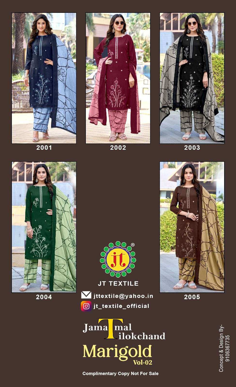 Buy Online JAMATMAL MARIGOLD PREMIUM RAYON PRINT & EMBROIDERY 3 PIECE SUIT EXPORT 5 Pcs of Full Catalogue at Wholesale Price. Looking for JAMATMAL MARIGOLD PREMIUM RAYON PRINT & EMBROIDERY 3 PIECE SUIT EXPORT Full Catalouge at Best Price? Buy Now JAMATMAL MARIGOLD PREMIUM RAYON PRINT & EMBROIDERY 3 PIECE SUIT EXPORT at Wholesale Rate of Rs 2725 with Total 5 Pcs from authroized dealer and supplier of JAMATMAL T Brand. Cost of Each piece is just only Rs 545 which is very low and affordable price to resale the product in your retail store Ethnic Export is Surat based Wholesale Supplier & Dealer of JAMATMAL T Brand. Click on Brand name to Know more about JAMATMAL T Brand's products.Call or Whatsapp on +91-9825759366 for booking or enquiry