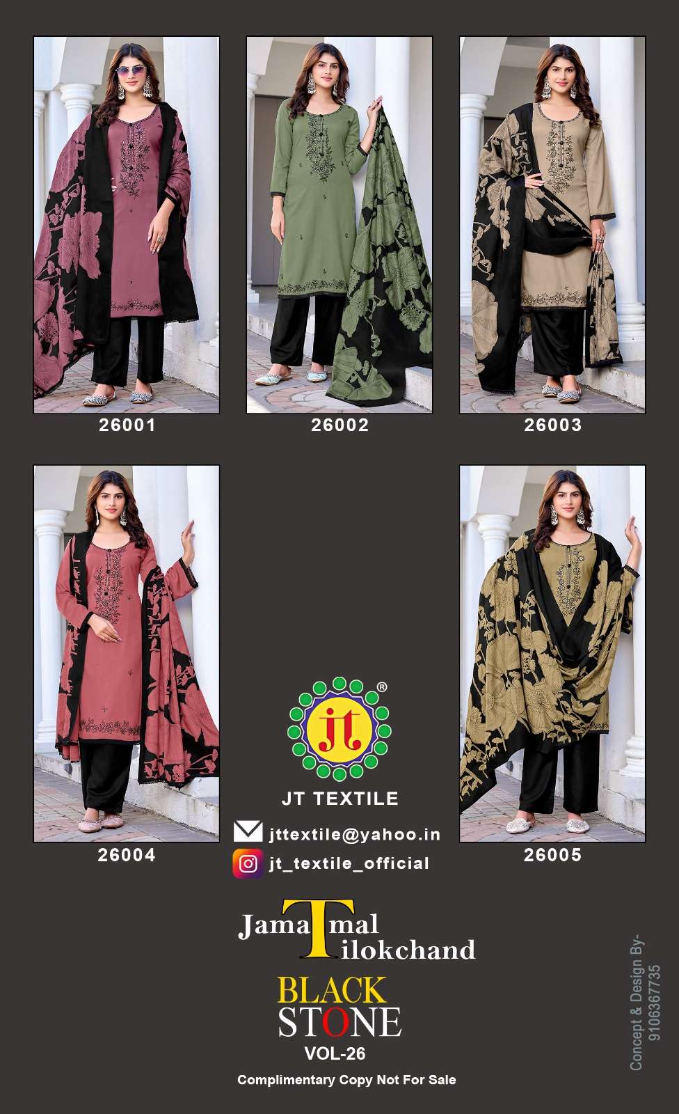 Buy Online JAMATMAL TILOKCHAND BLACK STONE 26 WEBSITE QUALITY RAYON SUIT BLACK PRINT 5 Pcs of Full Catalogue at Wholesale Price. Looking for JAMATMAL TILOKCHAND BLACK STONE 26 WEBSITE QUALITY RAYON SUIT BLACK PRINT Full Catalouge at Best Price? Buy Now JAMATMAL TILOKCHAND BLACK STONE 26 WEBSITE QUALITY RAYON SUIT BLACK PRINT at Wholesale Rate of Rs 2725 with Total 5 Pcs from authroized dealer and supplier of JAMATMAL T Brand. Cost of Each piece is just only Rs 545 which is very low and affordable price to resale the product in your retail store Ethnic Export is Surat based Wholesale Supplier & Dealer of JAMATMAL T Brand. Click on Brand name to Know more about JAMATMAL T Brand's products.Call or Whatsapp on +91-9825759366 for booking or enquiry