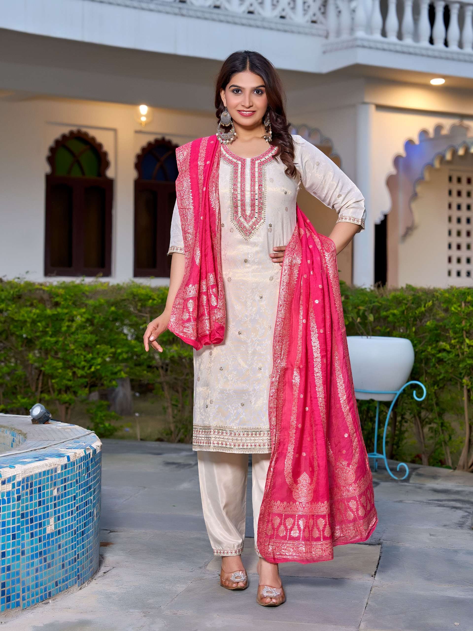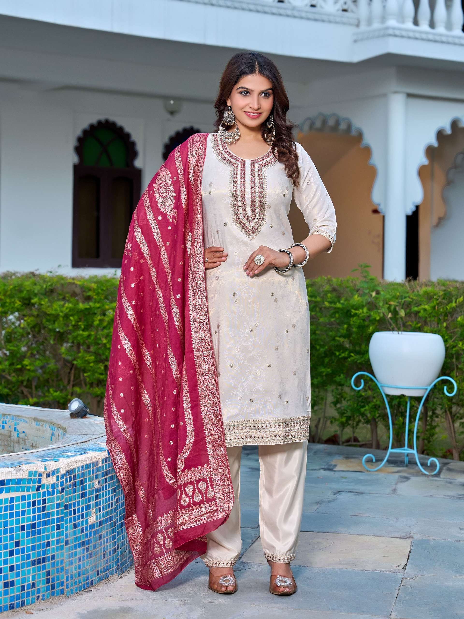 K 451 NEW BRAND PERFECT DESIGNER WHITE SUIT BANARASI DUPATTA SUPPLIER