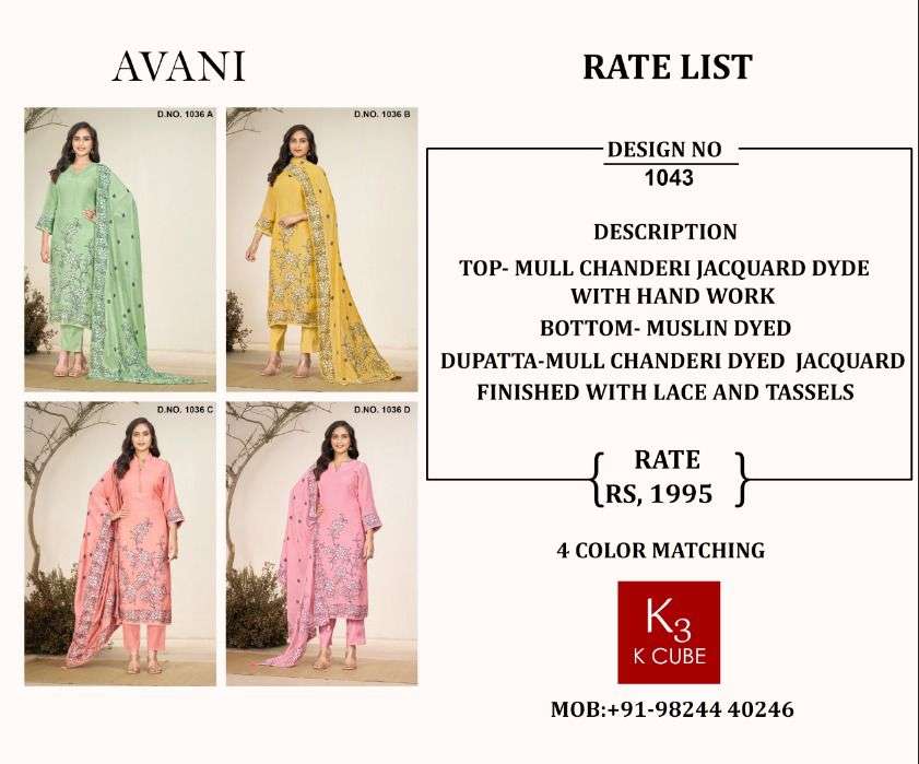 AVANI TOP- MULL CHANDERI JACQUARD DYDE BOTTOM- MUSLIN DYED DUPATTA-MULL CHANDERI DYED JACQUARD FULL SET ONLY |