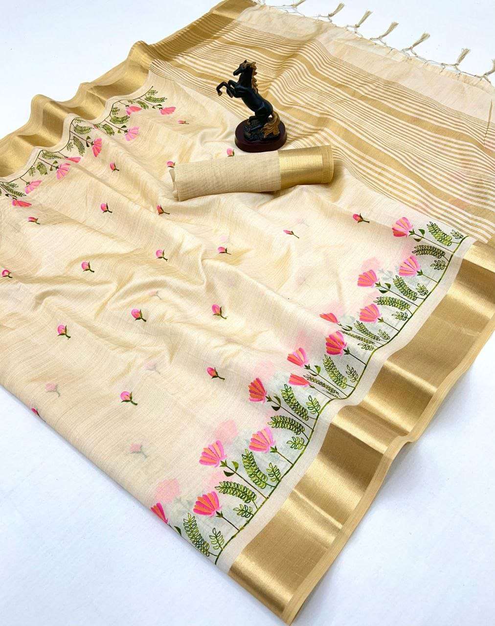 A timeless blend of Kerala’s traditional charm and modern embroidery artistry. Each saree is highlighted with a rich golden zari border ✨ and striped zari pallu with tassels 🎀, bringing out that royal festive glow. 🌿 Fabric: Pure Tissue kerala kasavu design 6 single also avaible |
