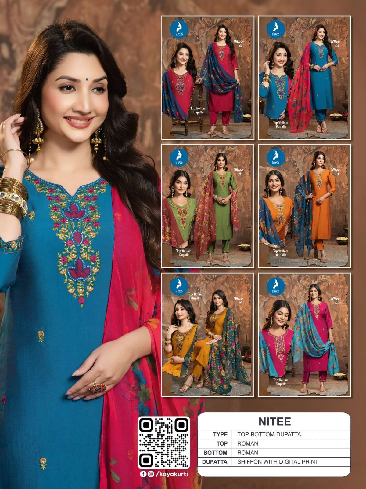 Buy Online KAYA KURTI NITEE READYMADE FANCY SALWAR SUIT TREND EVENT FUNCTION CLOTH 6 Pcs of Full Catalogue at Wholesale Price. Looking for KAYA KURTI NITEE READYMADE FANCY SALWAR SUIT TREND EVENT FUNCTION CLOTH Full Catalouge at Best Price? Buy Now KAYA KURTI NITEE READYMADE FANCY SALWAR SUIT TREND EVENT FUNCTION CLOTH at Wholesale Rate of Rs 5520 with Total 6 Pcs from authroized dealer and supplier of Kaya Kurtis Brand. Cost of Each piece is just only Rs 920 which is very low and affordable price to resale the product in your retail store Ethnic Export is Surat based Wholesale Supplier & Dealer of Kaya Kurtis Brand. Click on Brand name to Know more about Kaya Kurtis Brand's products.Call or Whatsapp on +91-9825759366 for booking or enquiry